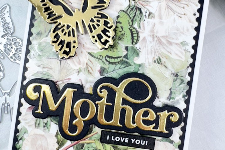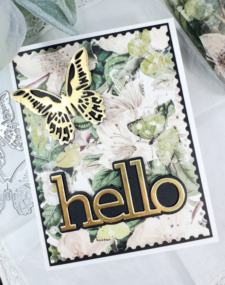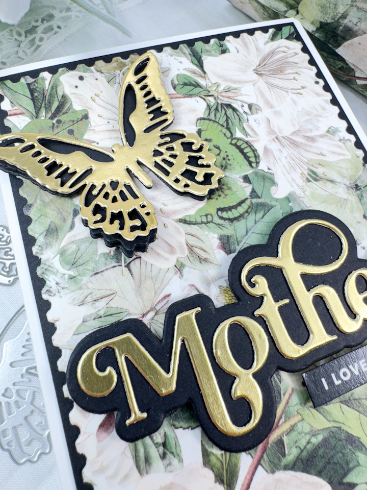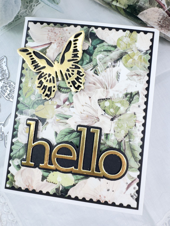 I began this project by smoothing out a panel of the washi tape onto Neenah 110lb cardstock, and using the coordinating die to trim those pieces out. I then went ahead and gold foiled the Leafy Lattice and trimmed that out with coordinating die as well. I wanted a background for all of my elements, so I used the Sparkling Diamonds die cut. I haven’t been able to locate this die cut on the Pinkfresh website, so I’m not sure if it has been discontinued. But, I thought it worked really well with the way I wanted to orient the lattice.