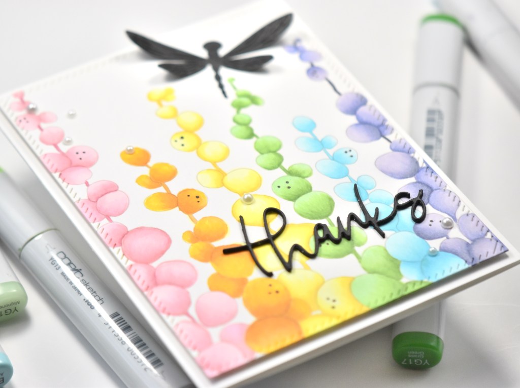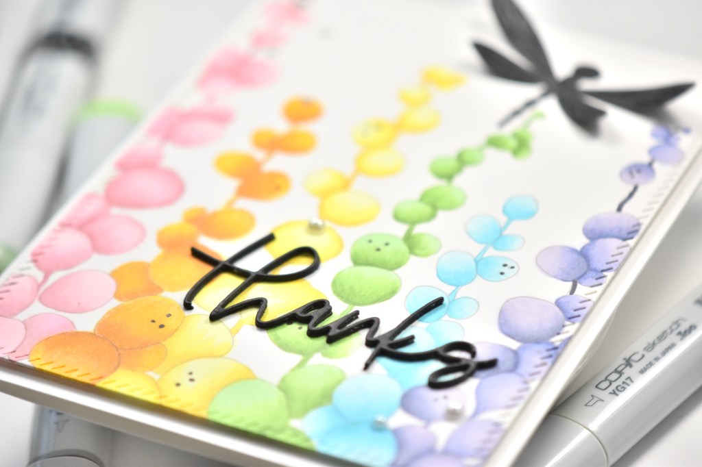 The sentiment is from my stash, and it was created using the PinkFresh Studio Wonderful Sentiments set and some gold foil. When foiling sentiments, I usually create a bunch at once and then just put them in a storage container until I’m ready to use them. It’s just a little time saver that I find to be quite helpful. To finish up, the sentiment was adhered to the card using liquid glue.
