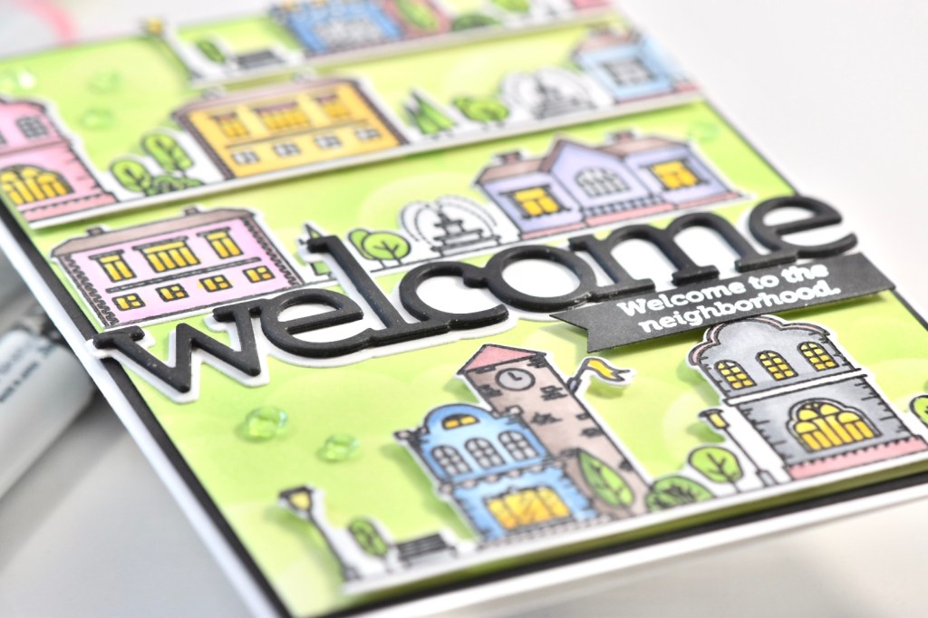 To begin, I used the PinkFresh Studio Diagonal Stitched Rectangles to cut a panel of Neenah Classic Crest 110lb cardstock. I took a leftover colored frame from the previous set of cards and trimmed it down to 4.0 x 5.25″ and taped it to a separate white panel using masking tape. I then used a tape runner with removable tape to put a little strip in all the flower openings, and affixed the flowers atop that.