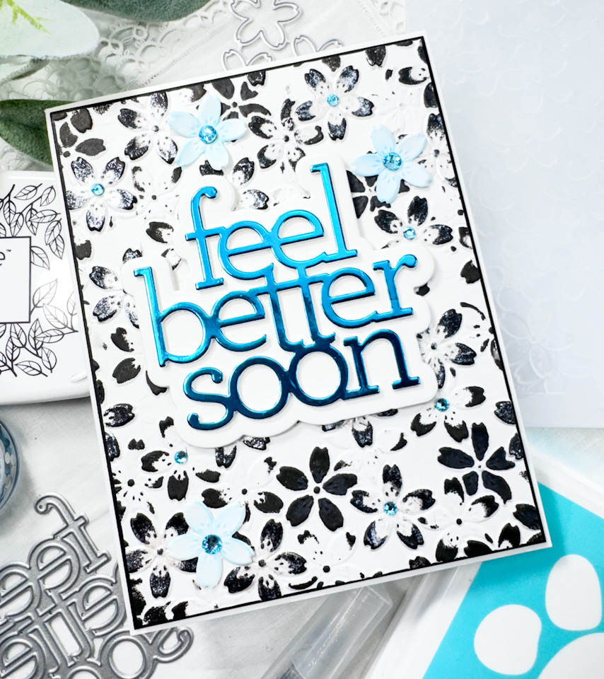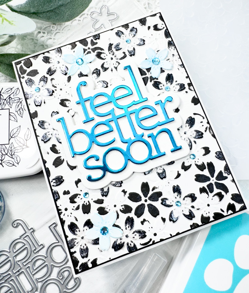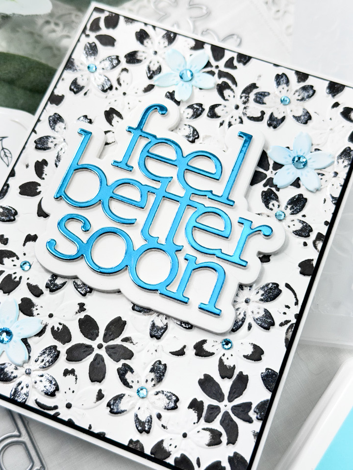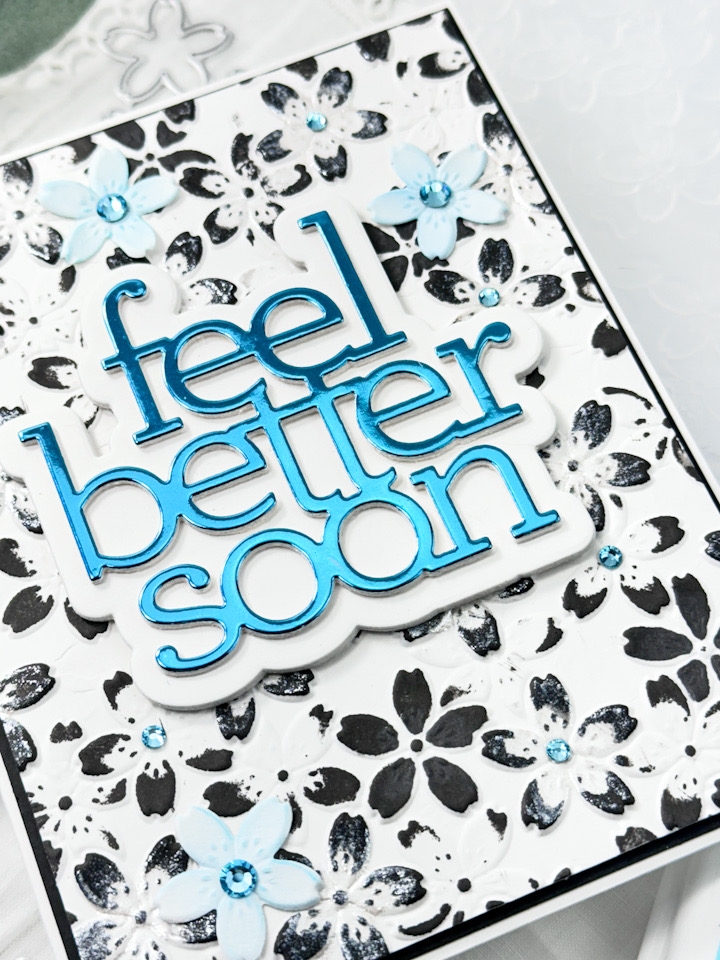 Now to assemble this masterpiece! I adhered the embossed panel to the card base and glued the leaves in place first, followed by the flowers. The two larger flowers, as well as the sentiment, were adhered using foam strips for a little added dimension. To finish up, I added some PFS Gold Metallic Pearls to tie everything together.