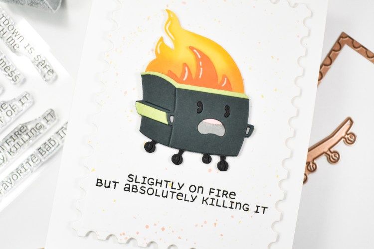 I began this project by die cutting the pieces of the Dumpster Fire from various colors of cardstock from my stash. I did some ink blending on the fire pieces before assembling everything using liquid glue.