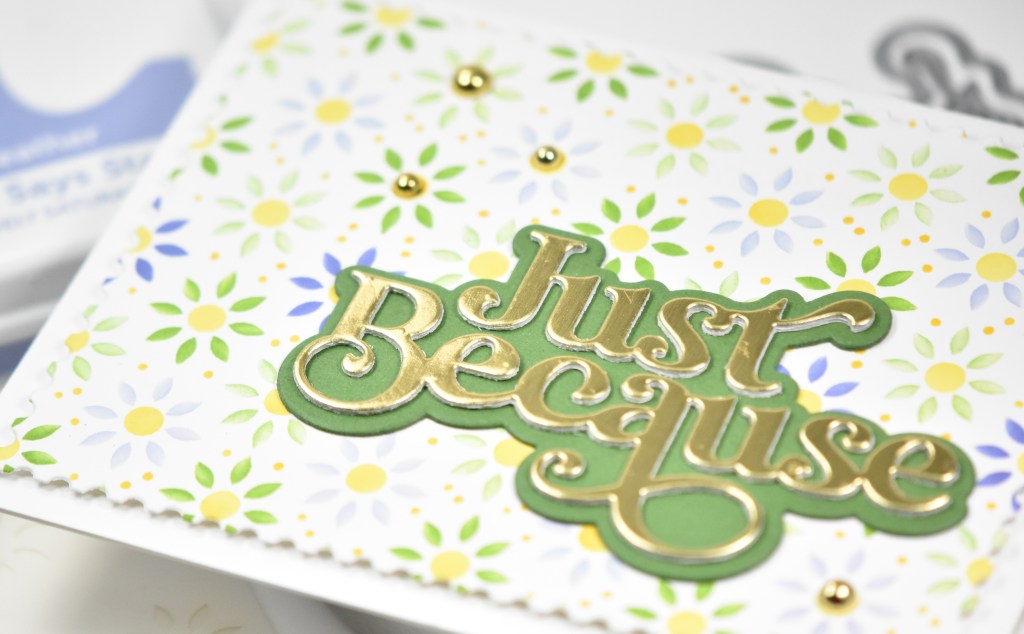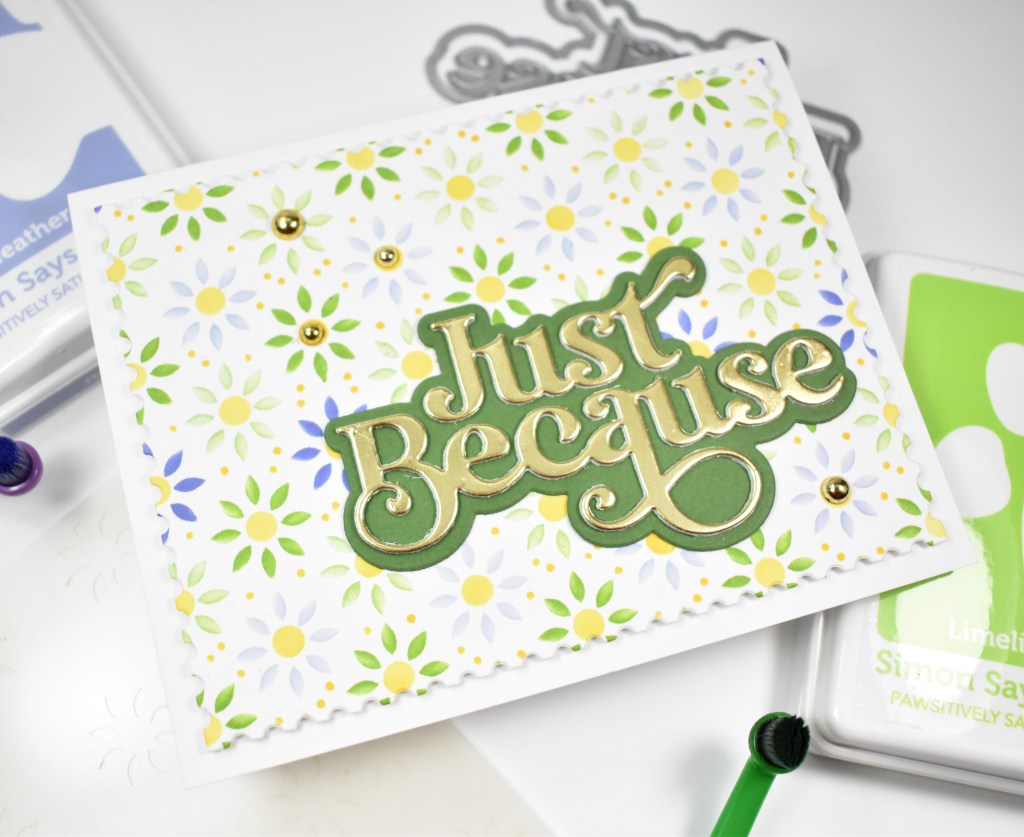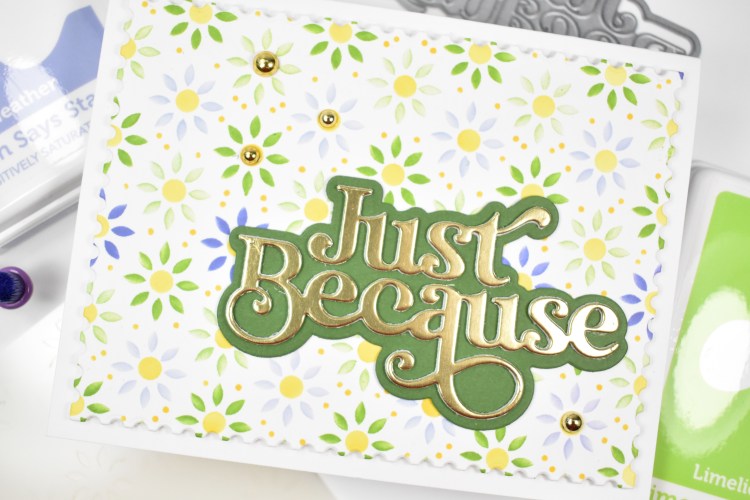 Once done with the inking, I trimmed the panel down using the Postage Stamp Edge Frames and prepared the sentiment. I die cut the Fancy Just Because once from gold cardstock and twice from Neenah, while cutting the shadow portion from green cardstock. I adhered the panel to the card base using foam tape and secured the sentiment with liquid glue. Some gold pearls were added to finish up.