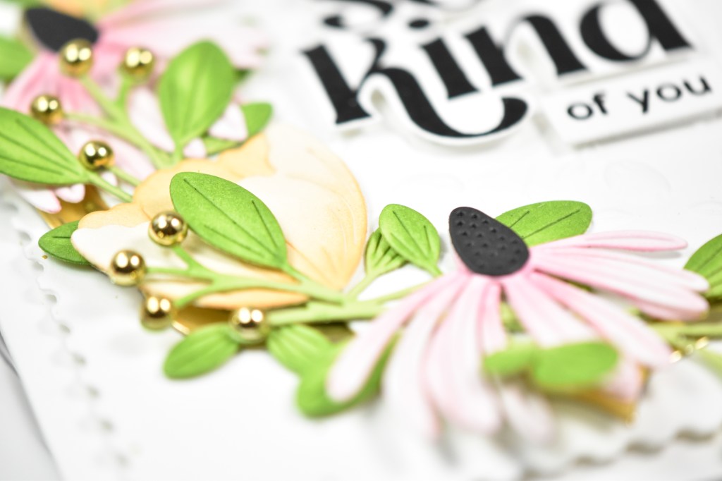 The leaves were secured in place using liquid glue, while the flowers and the sentiment were adhered using foam strips. To finish up, everything was adhered to the card base, and I added some gold metallic pearls to one leaf.