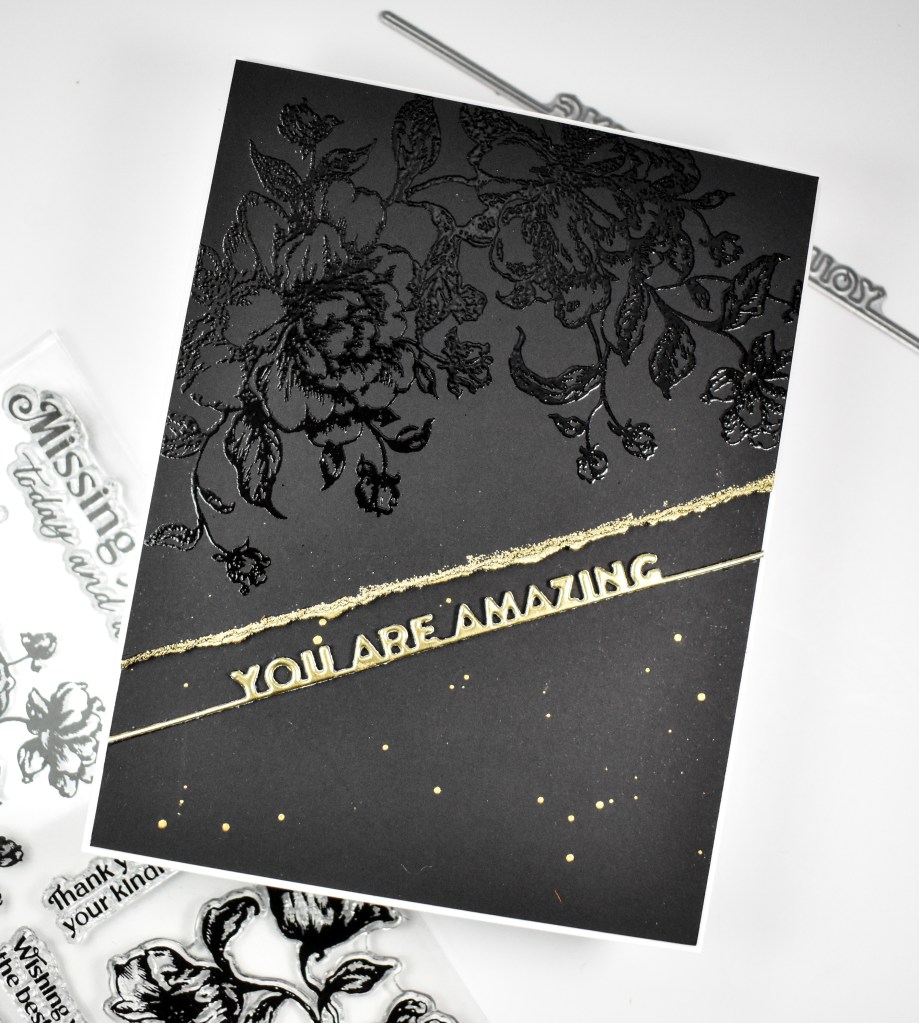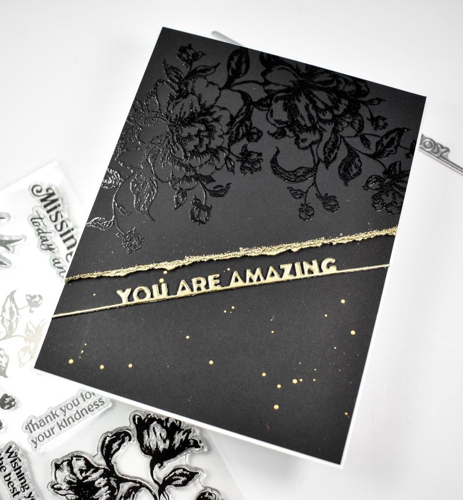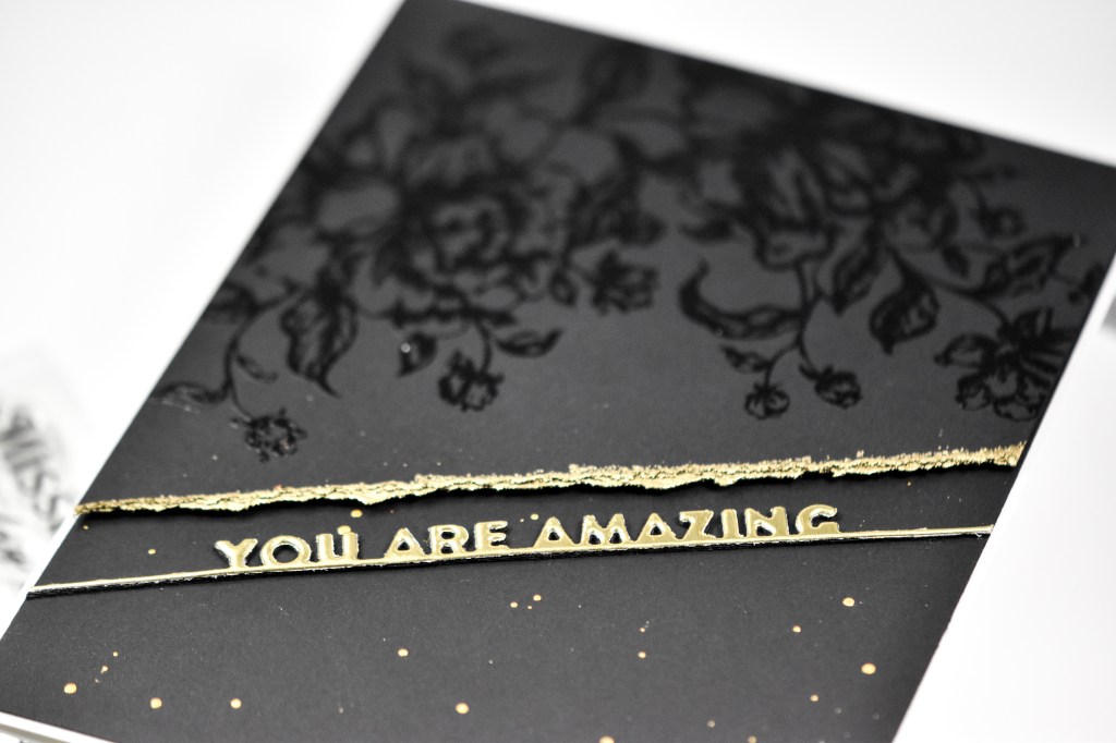 I gold foiled the Script Text plate onto Neenah 110lb cardstock, and gold foiled the sentiment onto black cardstock. I trimmed out the sentiment with the coordinating die, along with two additional cuts for a stacked sentiment. I trimmed the script background and gold splattered it before adhering it to a black panel.