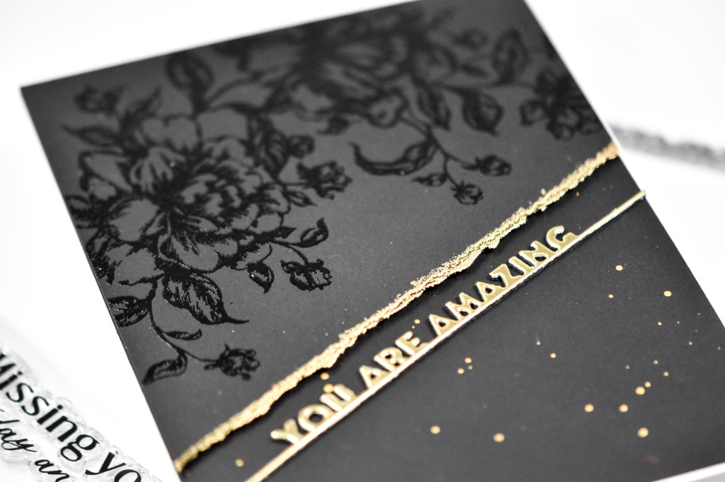 I wanted that rough edge to have some detail, so I rubbed the VersaMark Ink pad along the edge and heat set it using Ranger Princess Gold Embossing Powder. Before adhering the stamped panel to another black panel with foam tape, I gold splattered that for some additional interest.