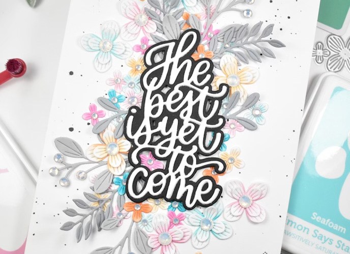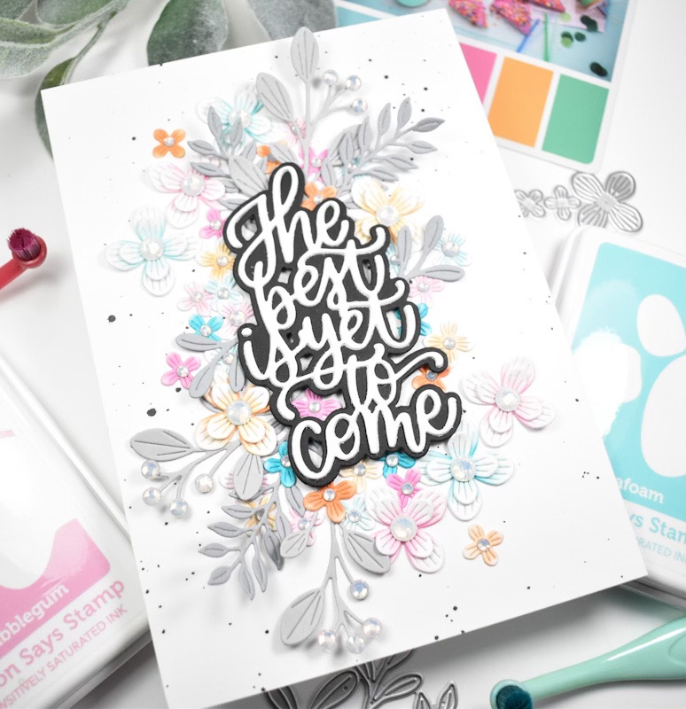 I began this project by die cutting some florals and leaves from the Spellbinders Vivid Blooms set using all of these colors from my subscription box. Once the florals were assembled, I went ahead and used the PinkFresh Studio Sparkling Diamonds plate on a panel of darker gray cardstock.