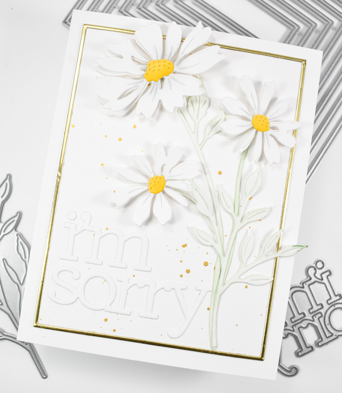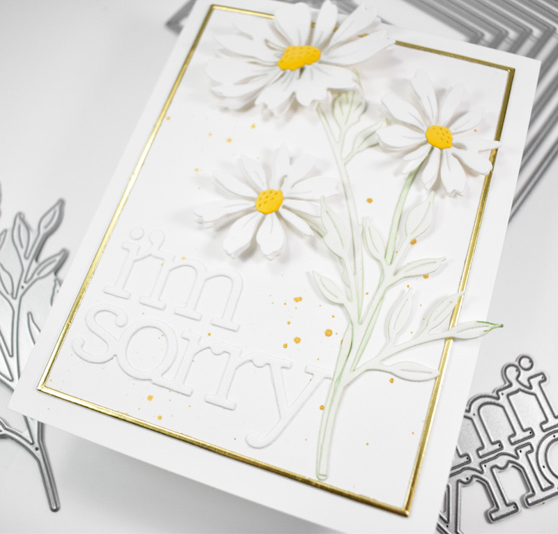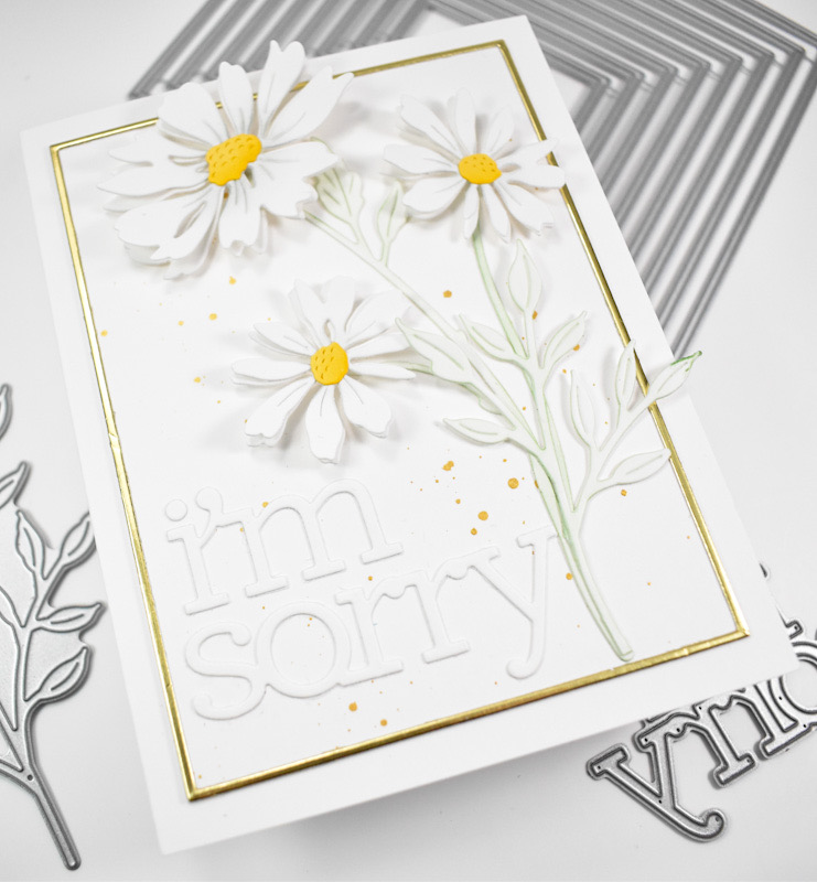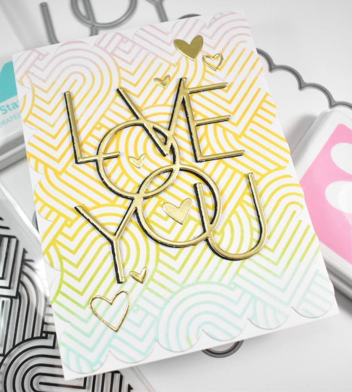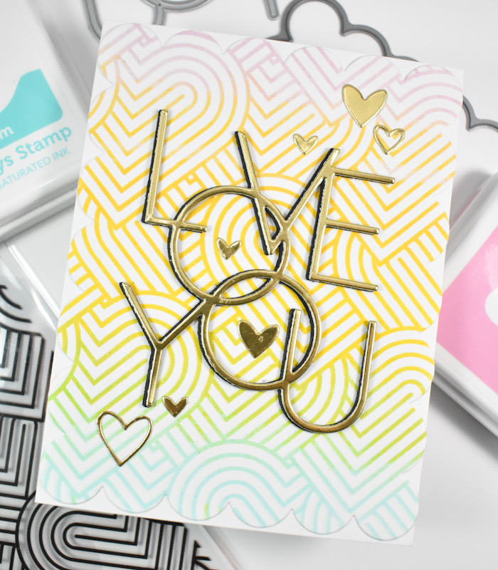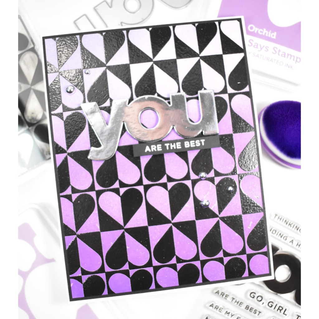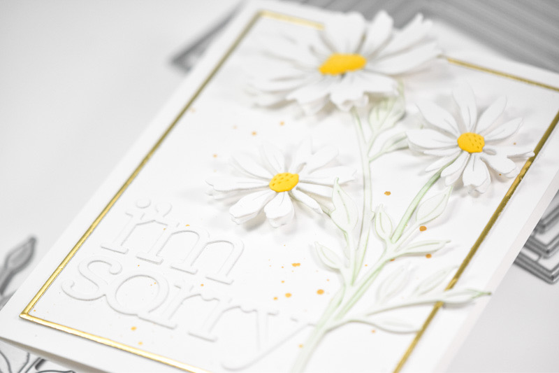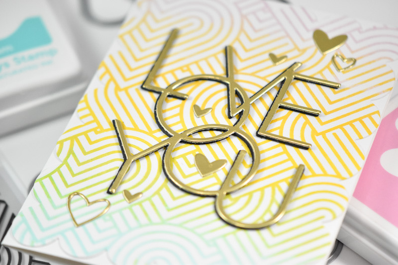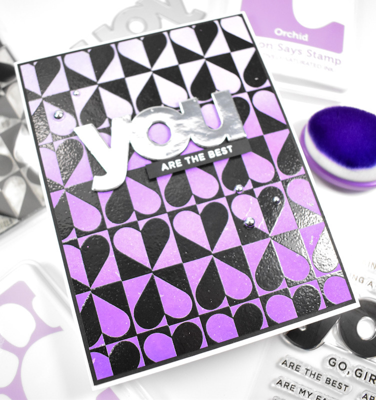 Before moving on, I did splatter that panel with some black acrylic ink for some added interest. The sentiment was created using the PinkFresh Studio Wonderful Sentiments and Opal foil. The was die cut several times to create a stacked sentiment.