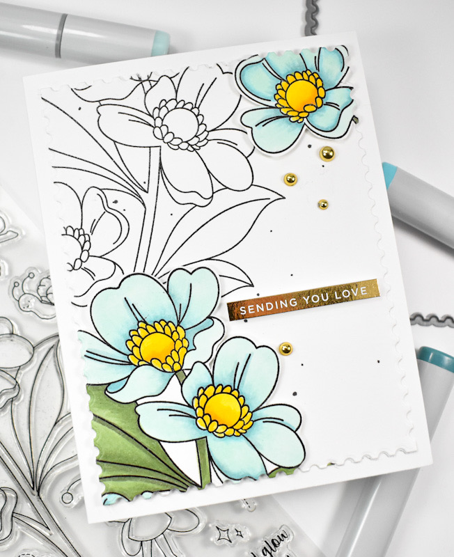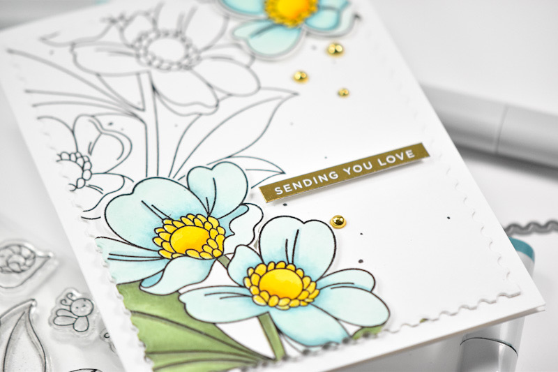 I began assembling the card by adhering the gray leaves first using liquid glue and then adhering the pink leaves atop those. I then adhered the outside flowers, again with liquid glue, and then adhered the center flower with foam tape. The sentiment was adhered with foam strips, and I tucked in some additional leaves to fill in. Clear drops were added to finish up.