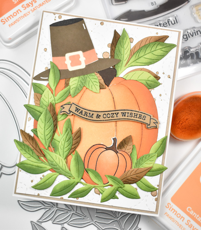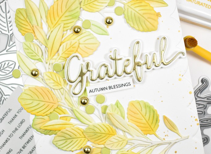 I then ink blended the edges of the stamped panel using Sky, Dusk, Night and Galaxy inks. Since I started with a light blue panel, I really only needed to ink the edges. I used a deckle edge die to trim the panel down before giving it a good dose of white splatter.