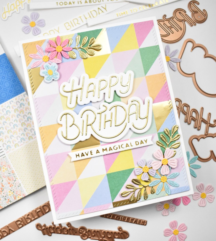Those pieces were then ink blended using Carnation, Field, Honey, Surf and Gravel inks before being assembled. I created the background using the Scribbled Letter folder and then lightly rubbed a gold ink pad across the raised side of the panel. The sentiment, which is from the new Holding Your Heart Sentiments BetterPress Plates, was gold foiled and trimmed down.