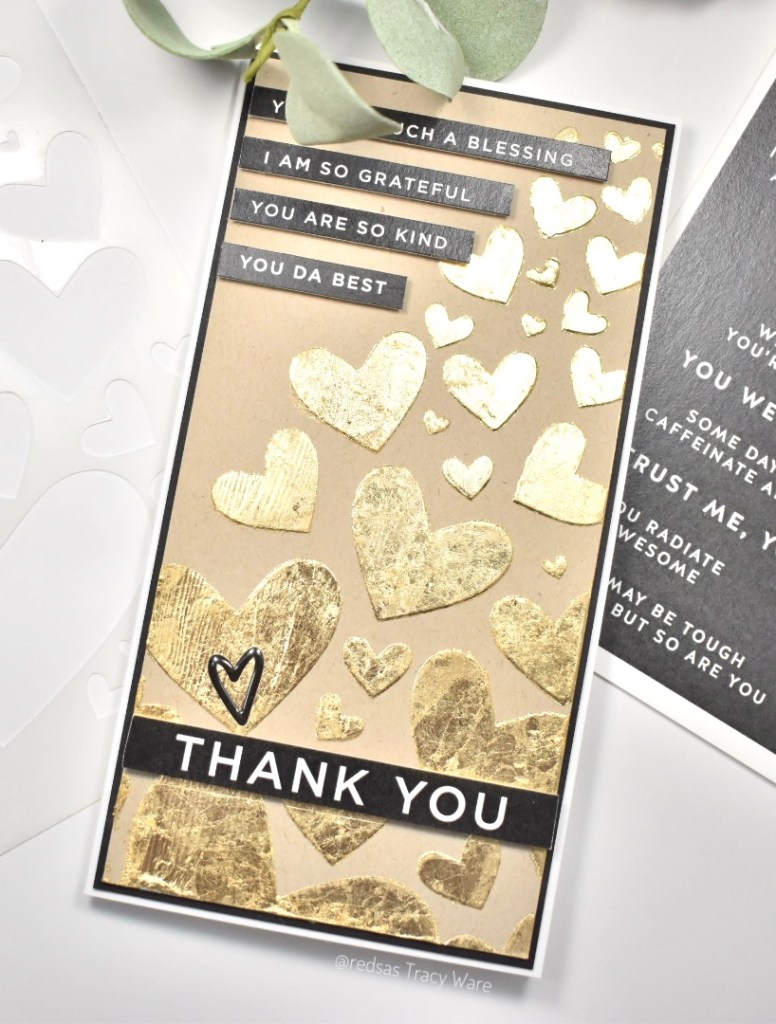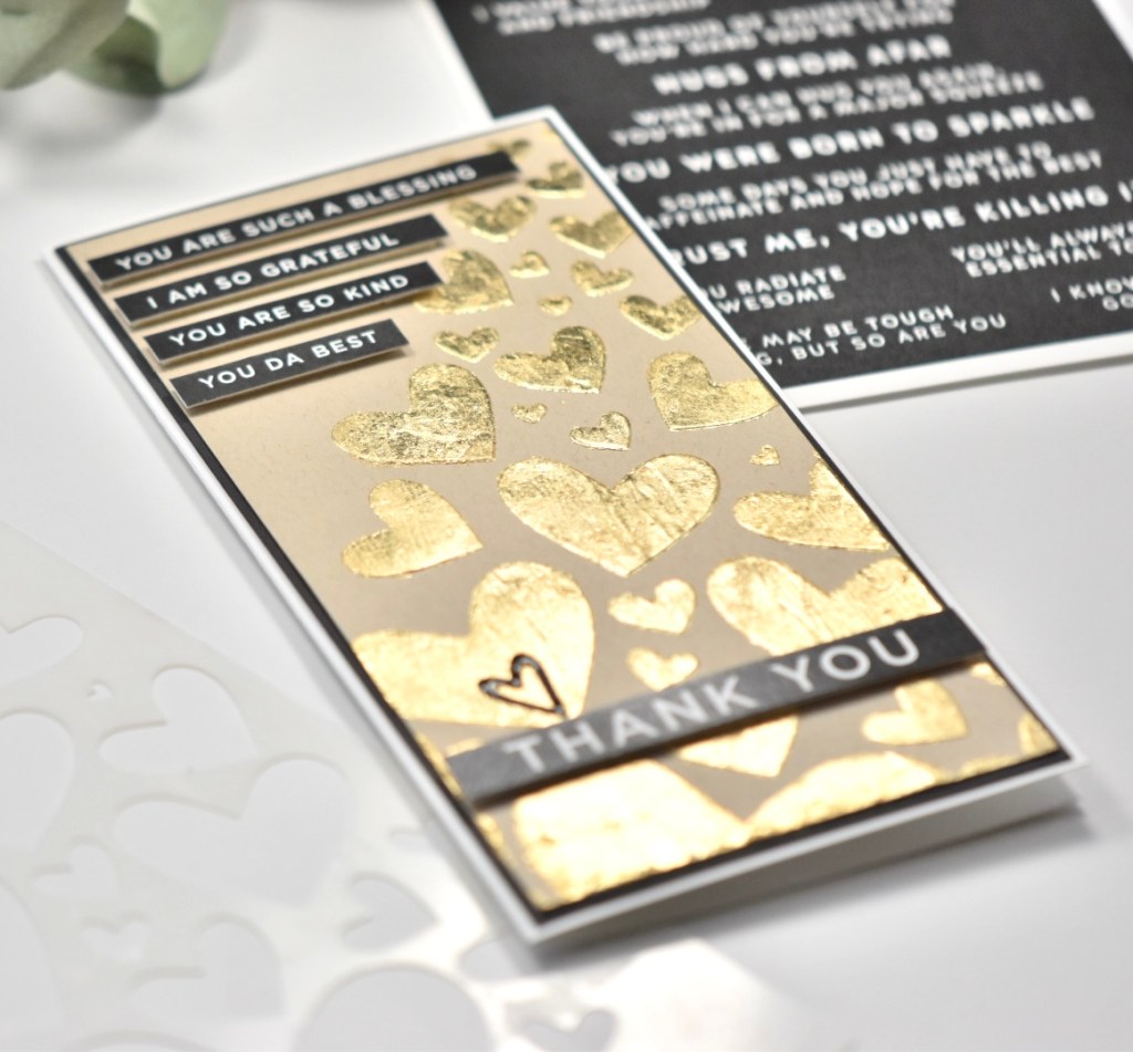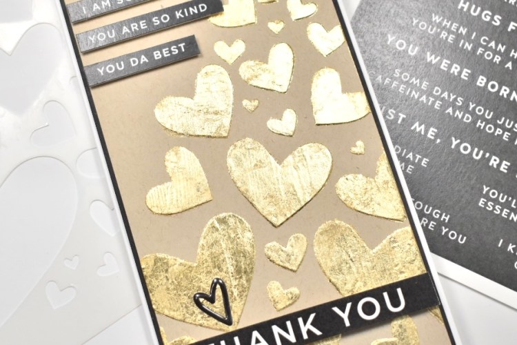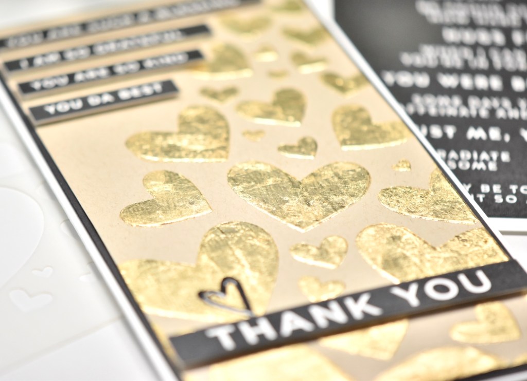 Once I was done stamping, I trimmed the panel down using the Chunky A2 Scalloped Rectangles. That was then adhered to the card base, and I went to work on the remaining elements of the card. I die cut the Lined Love You once from gold cardstock and three times from black cardstock and adhered all of those together using liquid glue.