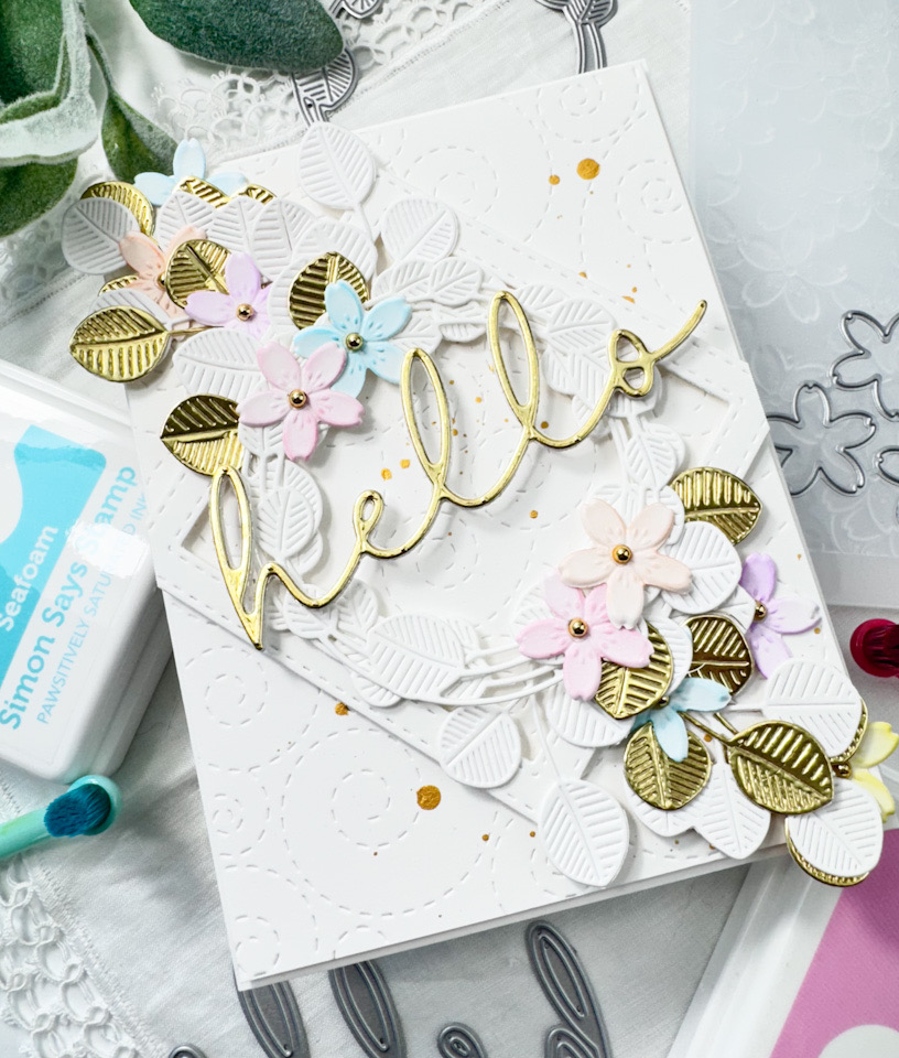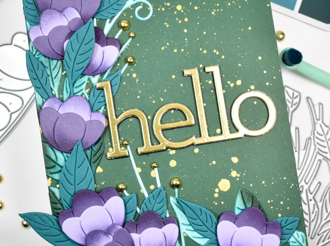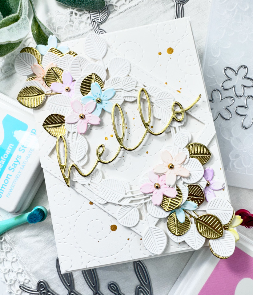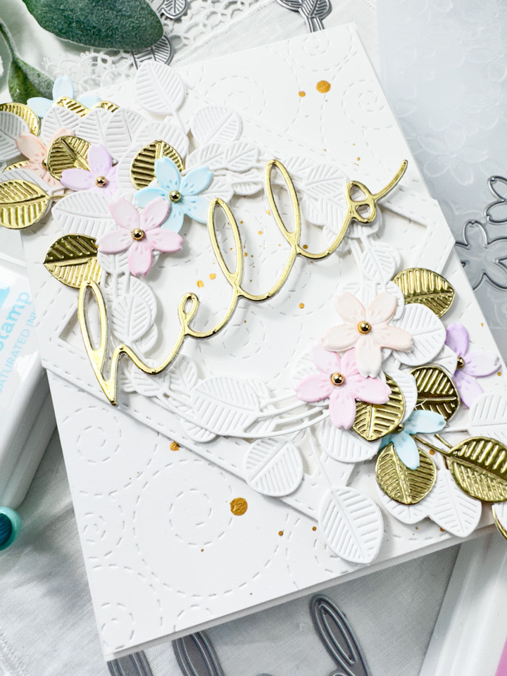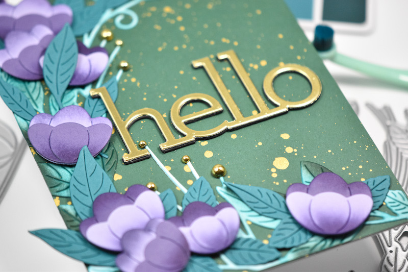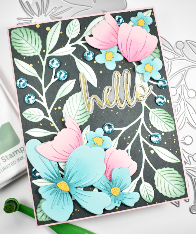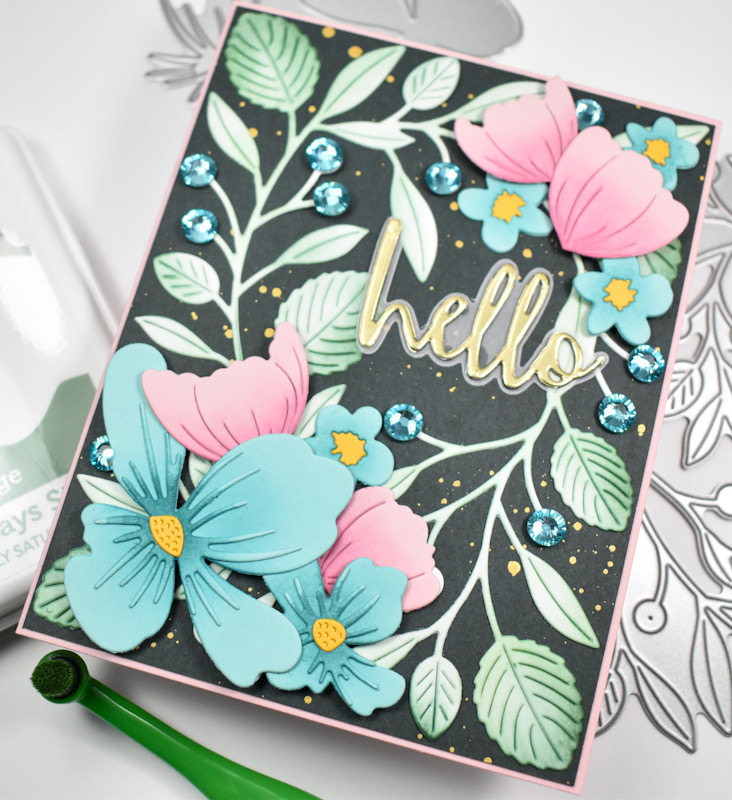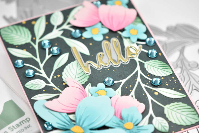 My background was created using a forest green cardstock with gold splatter, and I glued my leaf background to that. Most of the flowers were adhered using foam strips, while a few were glued directly atop the leaves. The hello sentiment was cut once from gold cardstock and twice from black cardstock, while the shadow portion was cut once from vellum. All of those pieces were adhered together and then glued directly to the panel. The panel was added to a Cotton Candy Pre-Scored card base, which is also from the Festive Fun release, and some Surf Dazzling Gems were added to finish up.