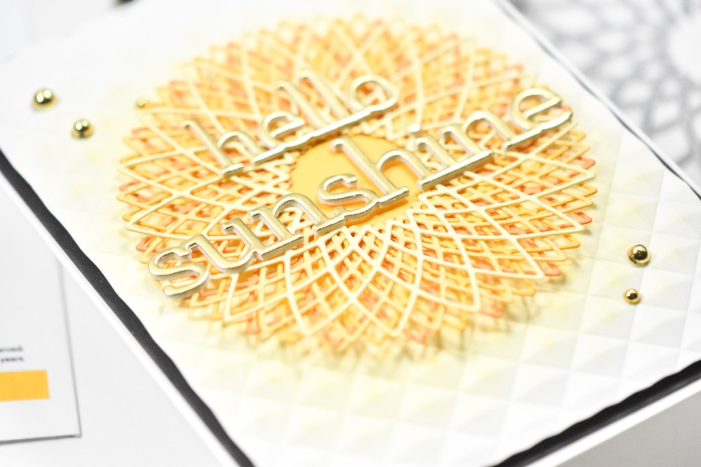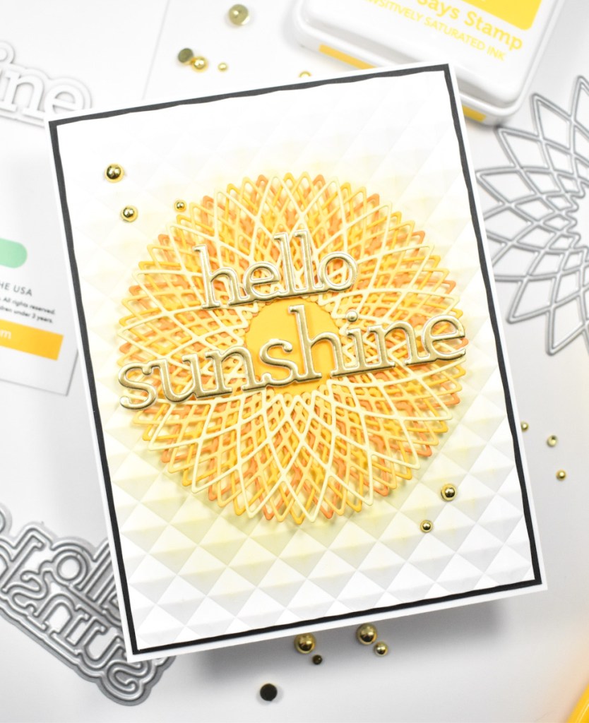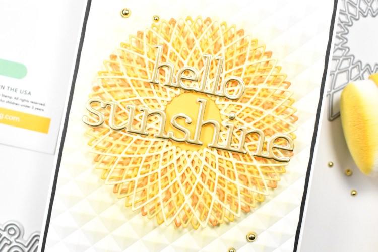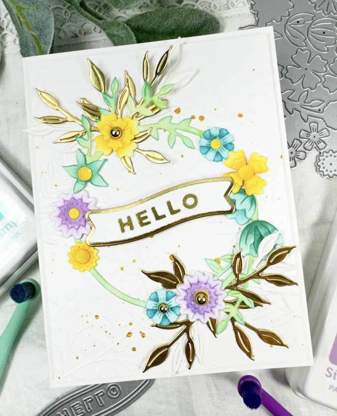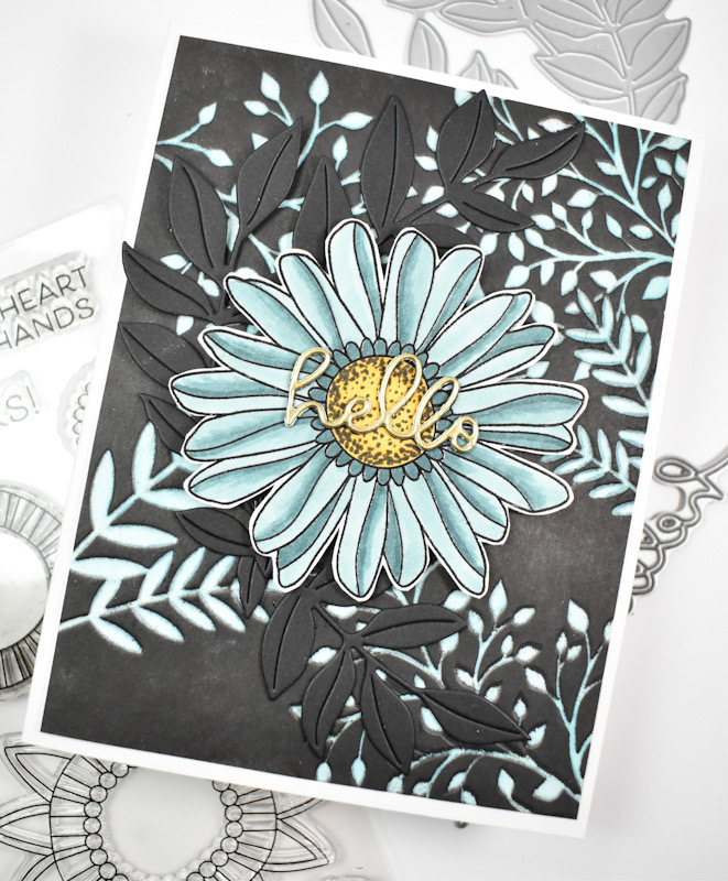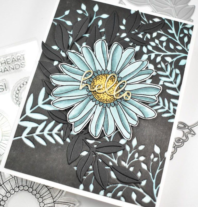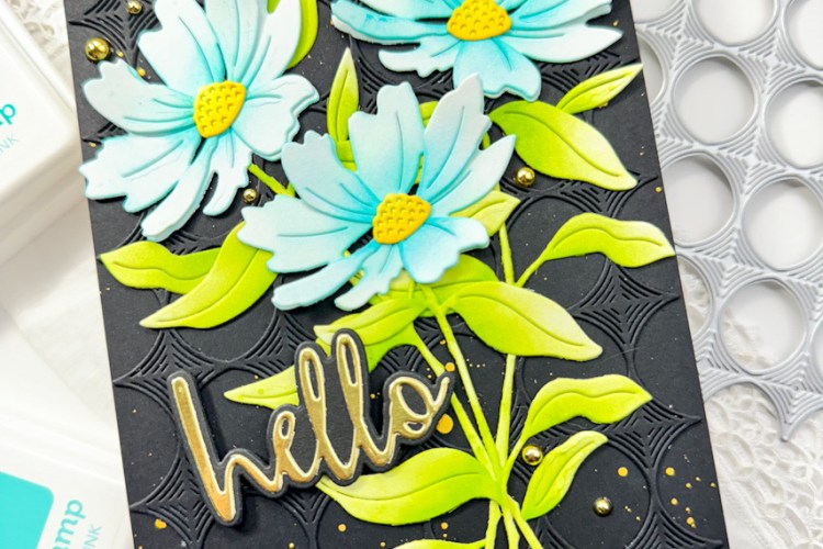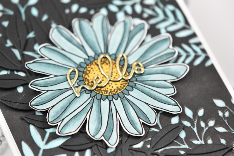 My background was created using a forest green cardstock with gold splatter, and I glued my leaf background to that. Most of the flowers were adhered using foam strips, while a few were glued directly atop the leaves. The hello sentiment was cut once from gold cardstock and twice from black cardstock, while the shadow portion was cut once from vellum. All of those pieces were adhered together and then glued directly to the panel. The panel was added to a Cotton Candy Pre-Scored card base, which is also from the Festive Fun release, and some Surf Dazzling Gems were added to finish up.