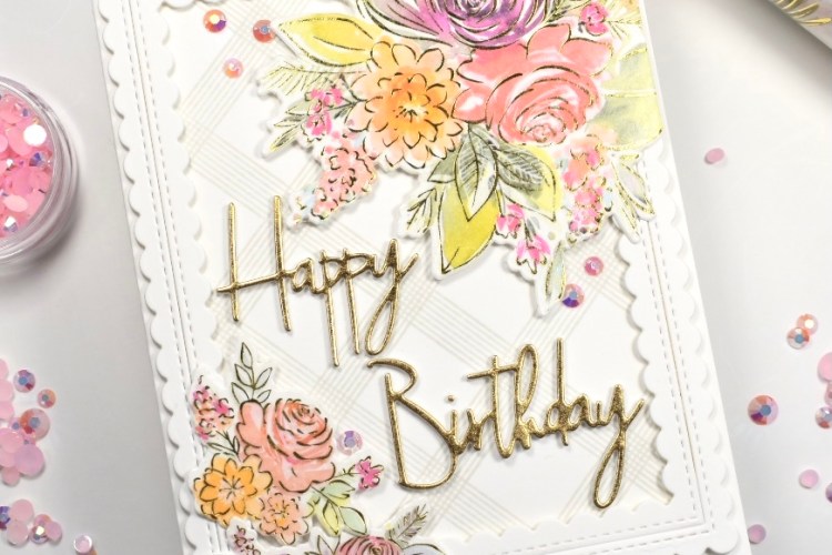 I used the PinkFresh Studio Stitched Scallop Rectangles to cut a panel of 110lb cardstock and die cut the Happy Birthday sentiment from the Classic Words die set. I cut the sentiment three times from 110lb cardstock and once from gold cardstock. Why? Because dimension is life! I will never stop saying that! I adhered all of my sentiment pieces together using Craft Tacky Glue.