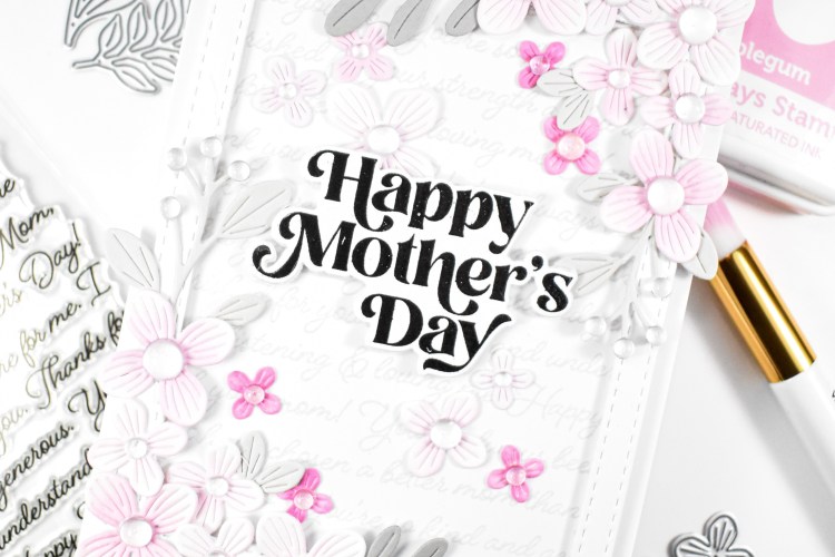 The flowers were ink blended using Bubblegum and Carnation inks. I applied different pressures to achieve different levels of ink intensity. The sentiment was stamped using VersaFine Onyx Black ink and double heat embossed for a smoother finish. Unfortunately, I was unable to locate this particular stamp set on the Simon website, but they have other great sets for Mother’s Day. I’ll link to one that is very similar for your convenience. That was cut several times using the coordinating die for a stacked look, which I love.