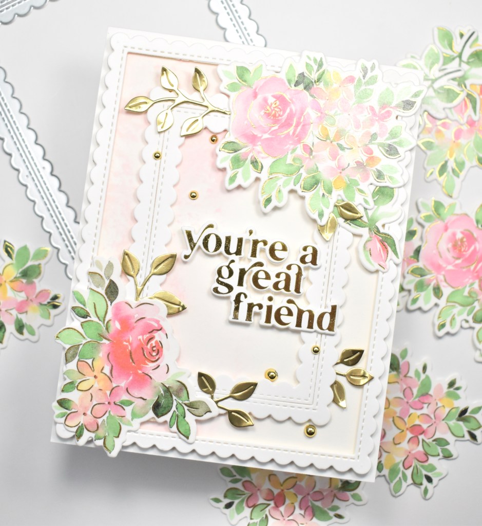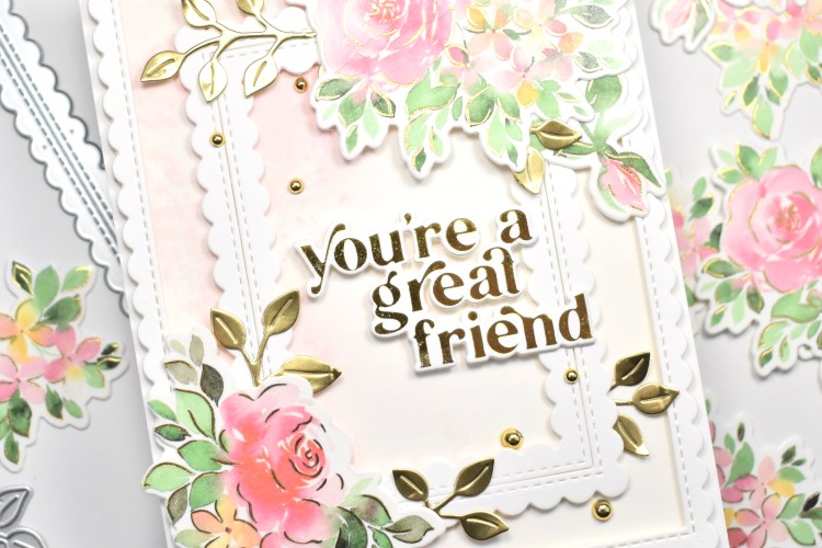 The sentiment was already in my stash, and that is from the Here For You Sentiments Press Plate, which I had gold foiled as well. I went ahead and adhered the sentiment in the center using the same foam strips, glued the green leaves in place, and then adhered the washi tape pieces, again with foam strips. To finish up, I added some Gold Metallic Pearls.
