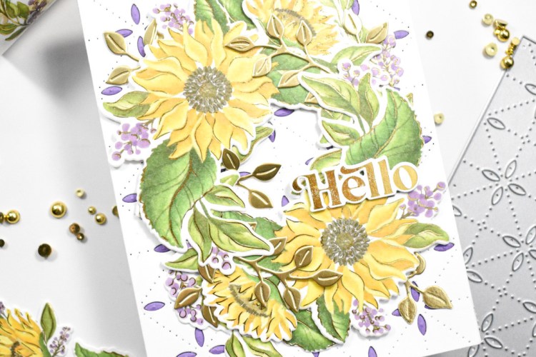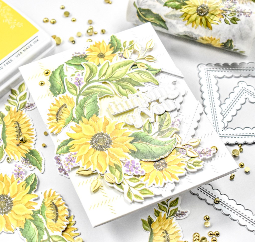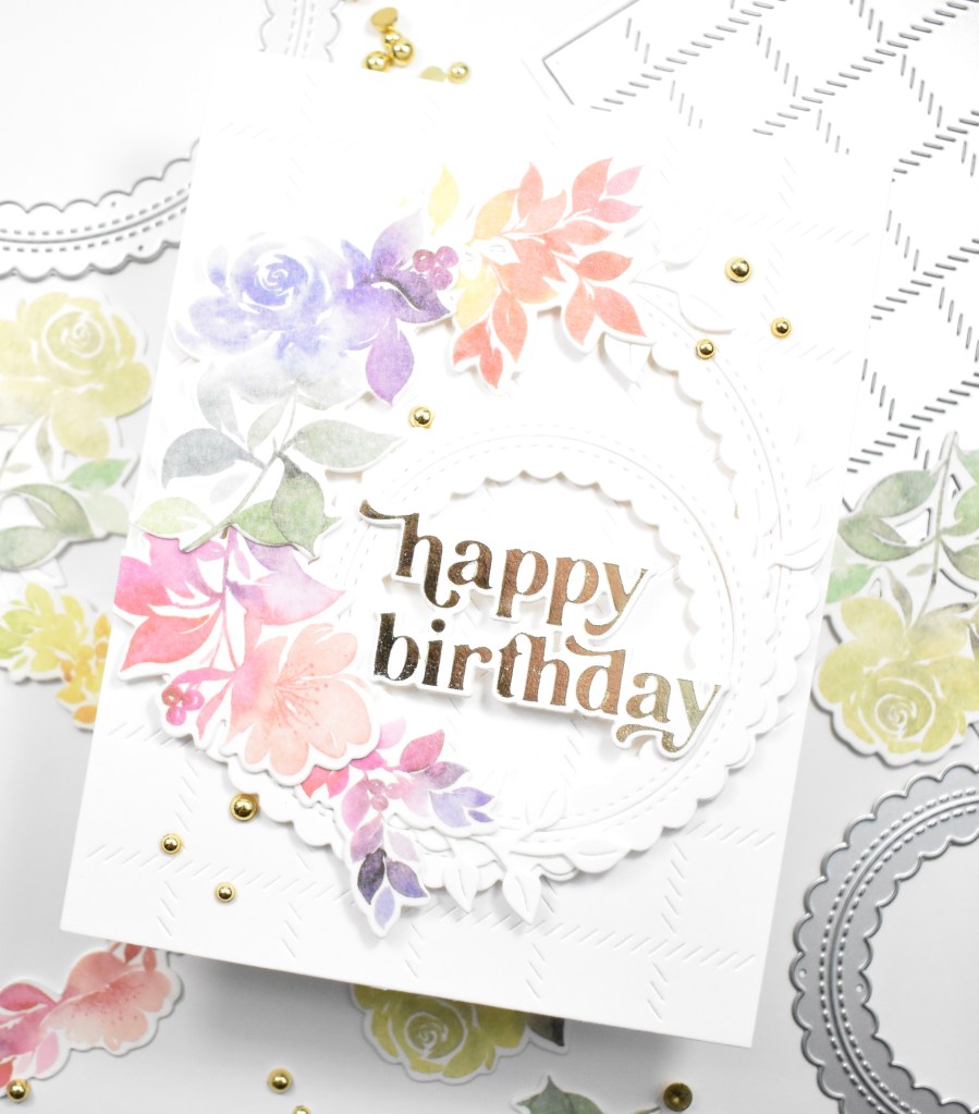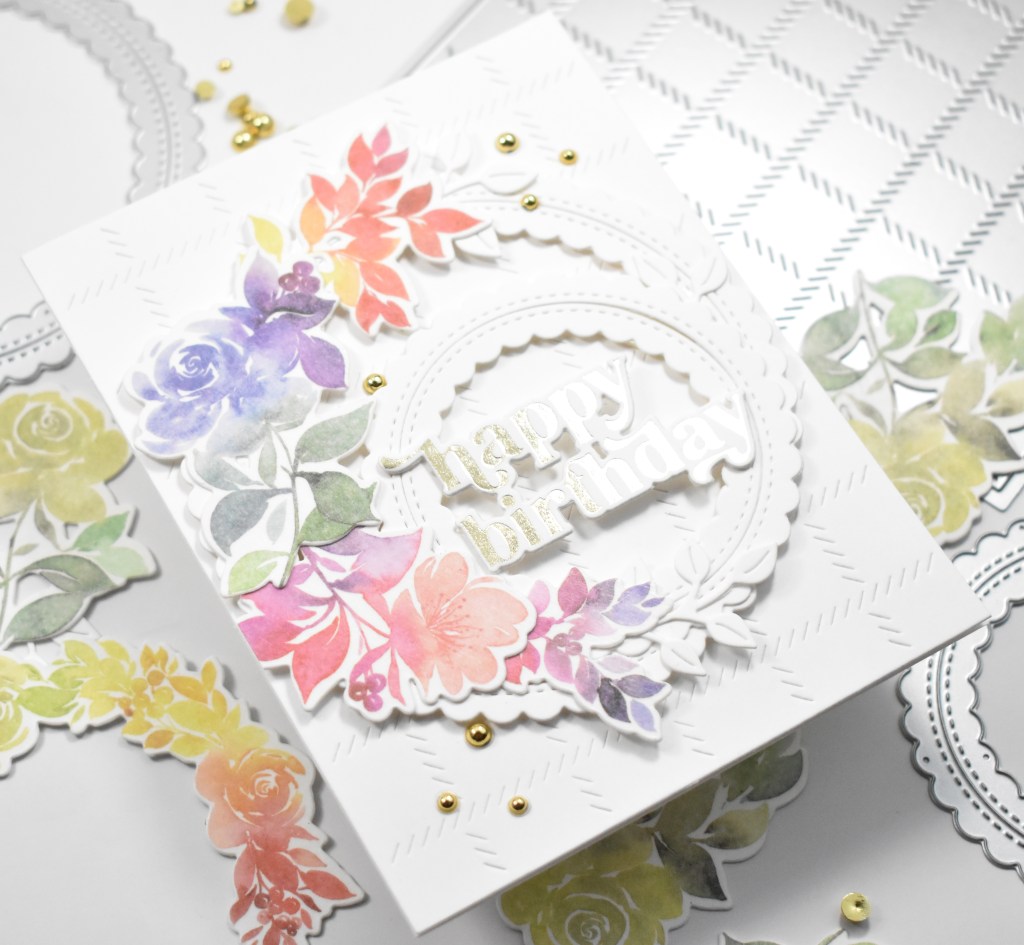 I began this project by smoothing out a panel of the washi tape onto Neenah 110lb cardstock, and using the coordinating die to trim those pieces out. I then went ahead and gold foiled the Leafy Lattice and trimmed that out with coordinating die as well. I wanted a background for all of my elements, so I used the Sparkling Diamonds die cut. I haven’t been able to locate this die cut on the Pinkfresh website, so I’m not sure if it has been discontinued. But, I thought it worked really well with the way I wanted to orient the lattice.
