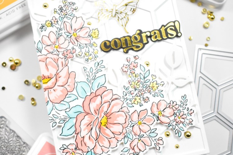 The sentiment is from the Spellbinders A little Message Sentiments that was created using the BetterPress Letterpress System, along with black ink. I used the included coordinating die to cut several pieces and adhered all of those together for a stacked look. The butterfly was adhered to the frames, and I used PFS Gold Metallic Pearls to add to the “budding” portion of the branches. The whole panel was then adhered to the card base using SSS Dot Tape Runner to finish up.