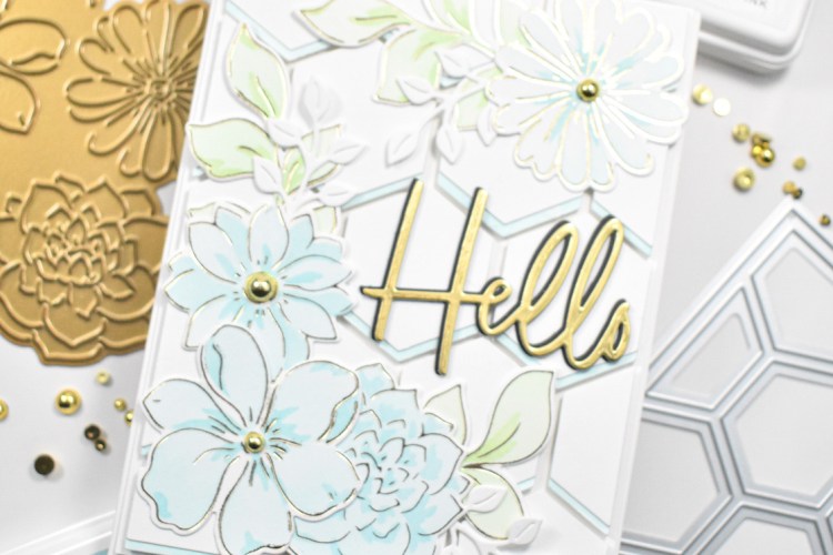 I used the PFS Sparkling Diamond to cut a panel of Neenah 110lb cardstock, and did some light ink blending using PFS Ballet Slipper ink. I also used the SSS Stitched Squares to cut some frames for interest. The squares were adhered to the ink blended panel using SSS 3D Foam Strips, and I then played around with the placement of the flowers to decide on the look of the card.