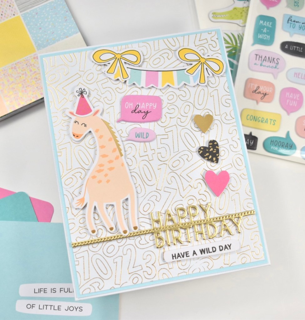 My First project uses all of the zodiac stickers on one card, and I absolutely love the grid format! I used a piece of the included patterned paper, along with an ephemera sentiment. Super simple, but I just love the colors!