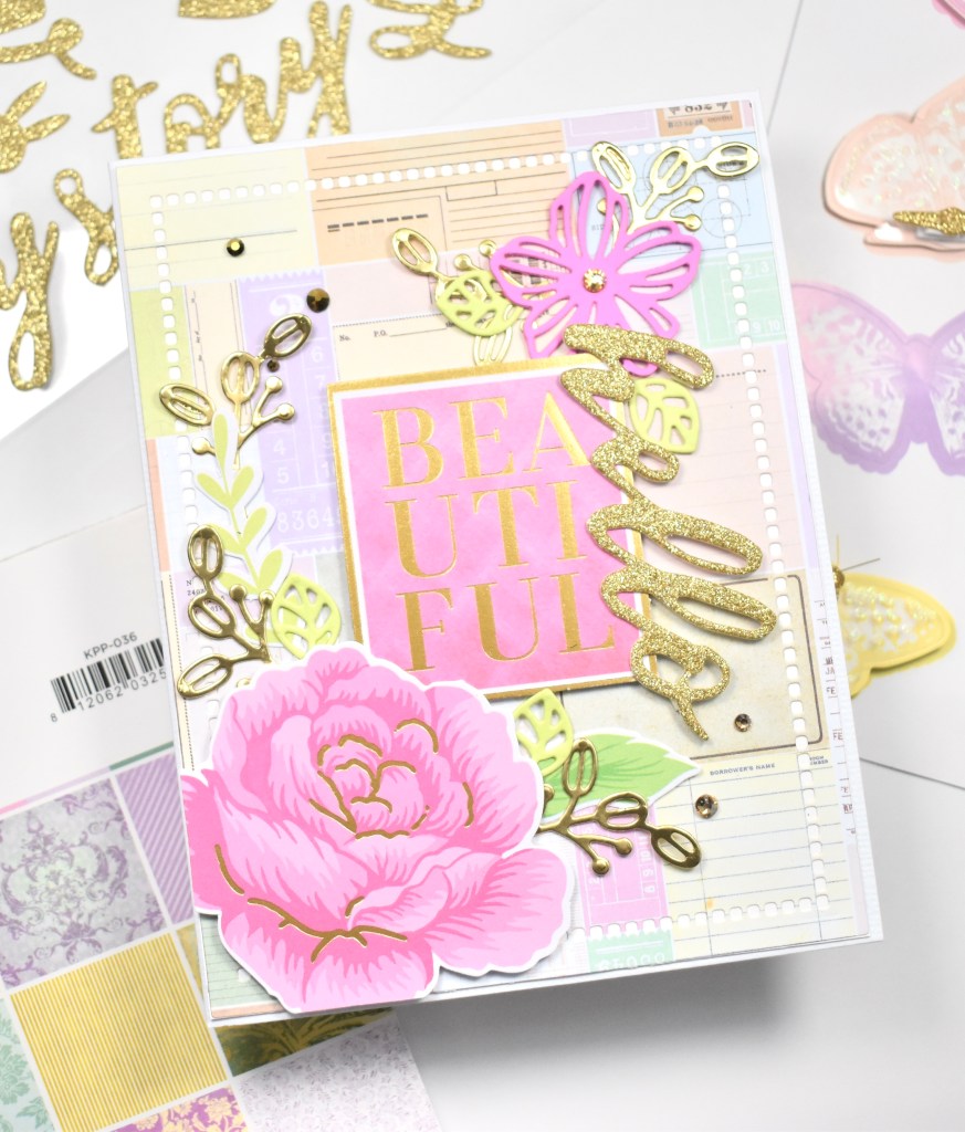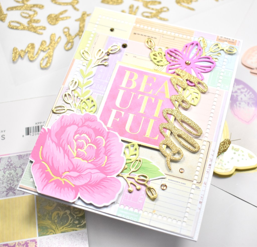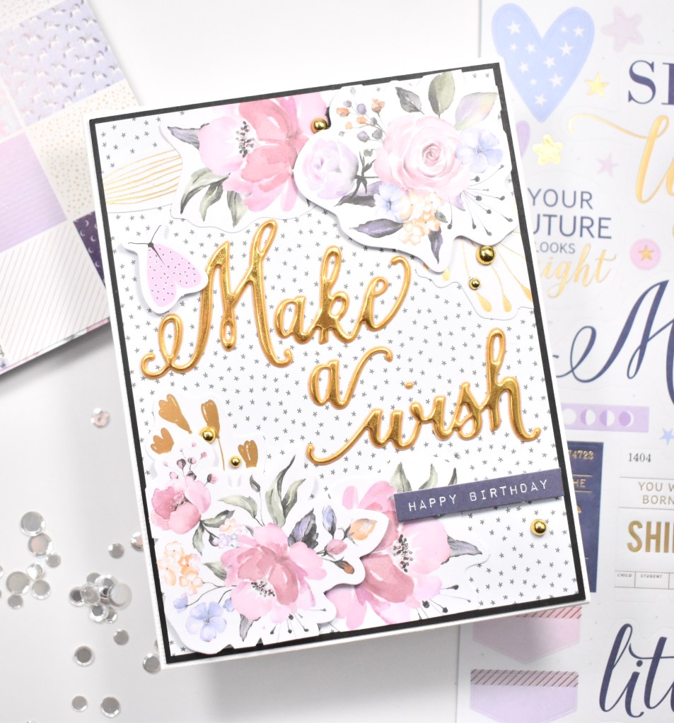 My third project, once again, only uses papers and ephemera pieces included in the kit. I placed the gold Make a Wish sentiment in the center of the patterned paper and arranged the floral pieces around it, adhering those with a combination of glue and foam tape. I added the sub-sentiment using foam tape, and also added some Spellbinders Fashion Gold Embellishments to finish it up.