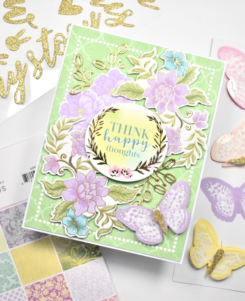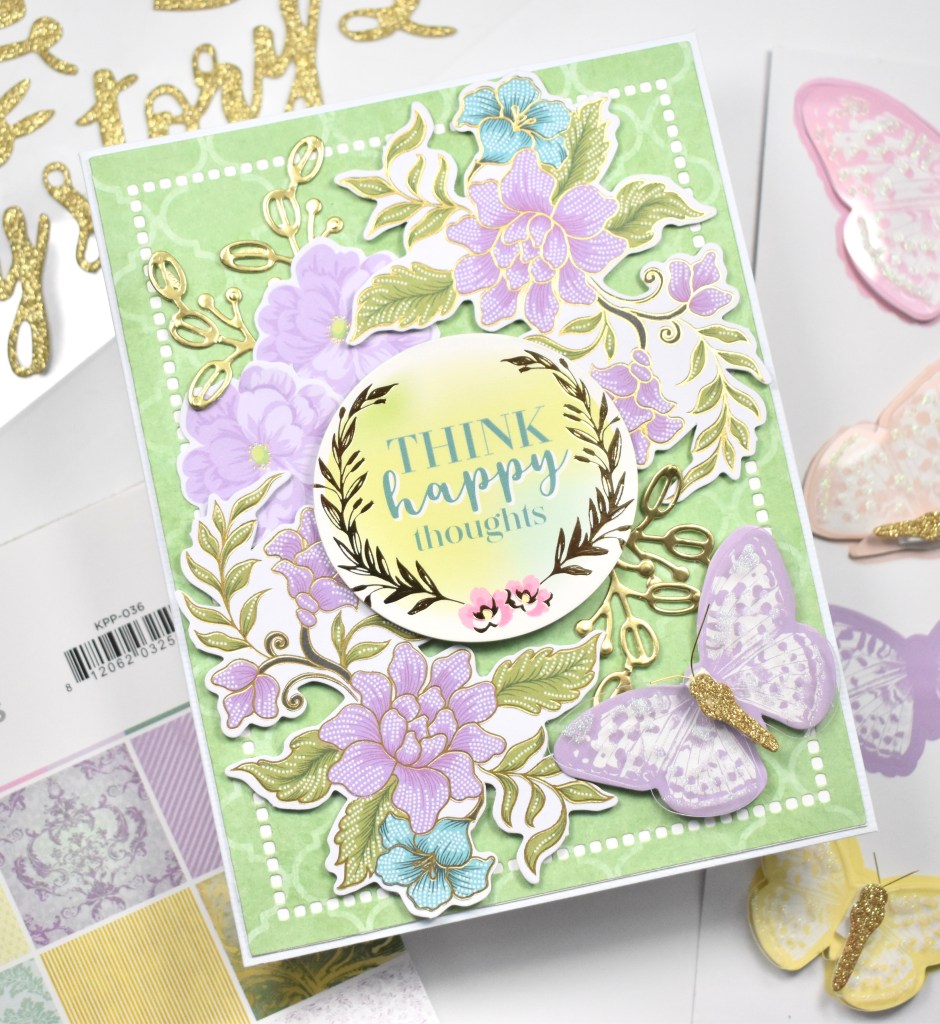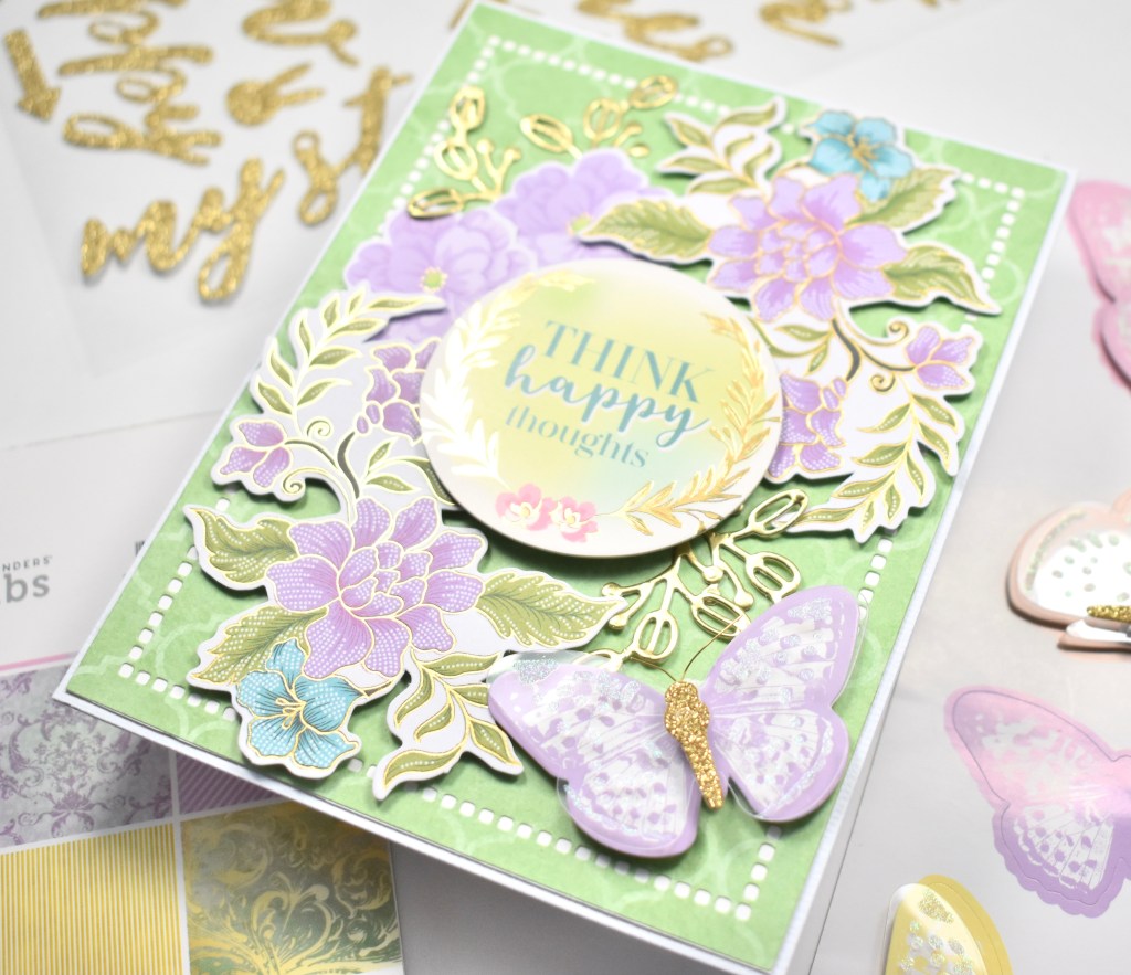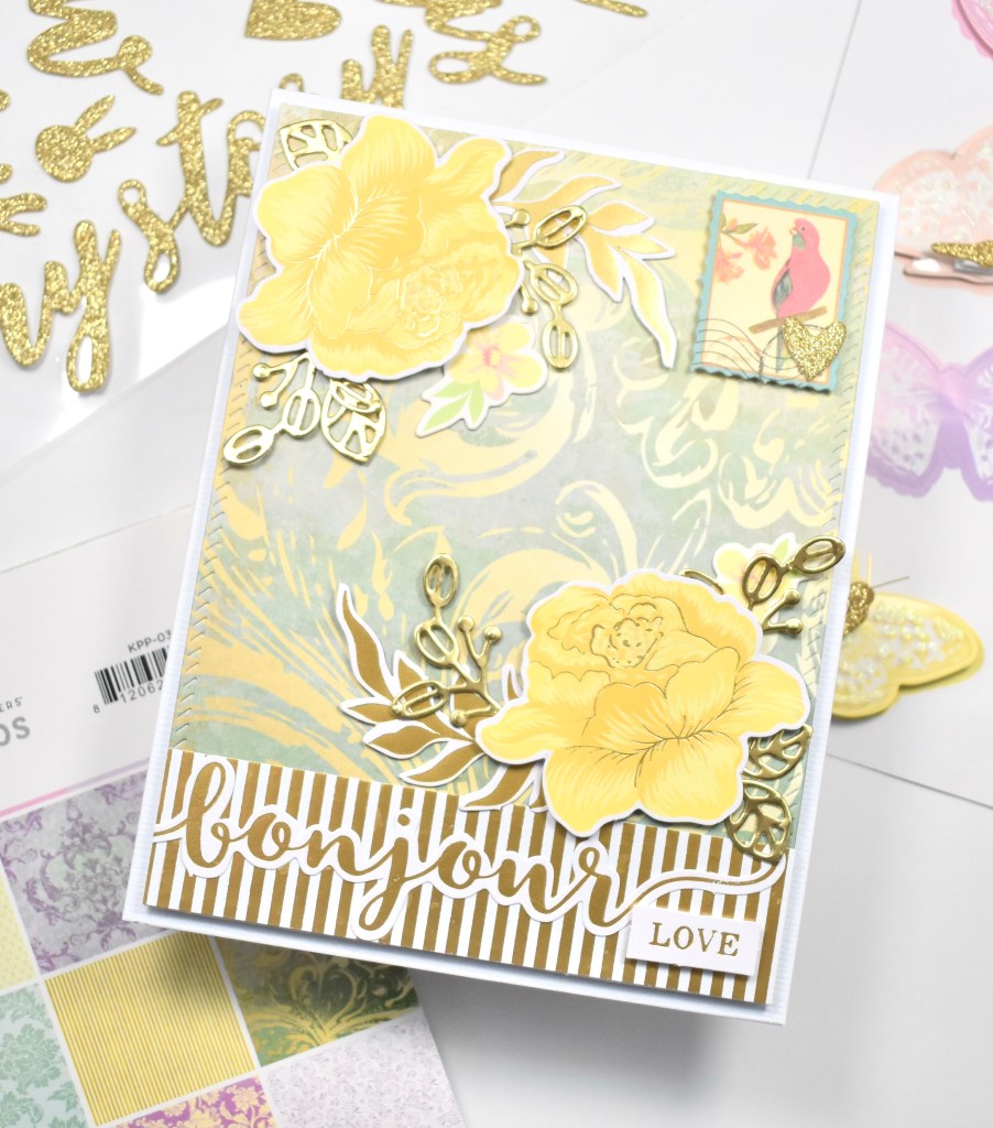 My third project, once again, only uses papers and ephemera pieces included in the kit. I placed the gold Make a Wish sentiment in the center of the patterned paper and arranged the floral pieces around it, adhering those with a combination of glue and foam tape. I added the sub-sentiment using foam tape, and also added some Spellbinders Fashion Gold Embellishments to finish it up.