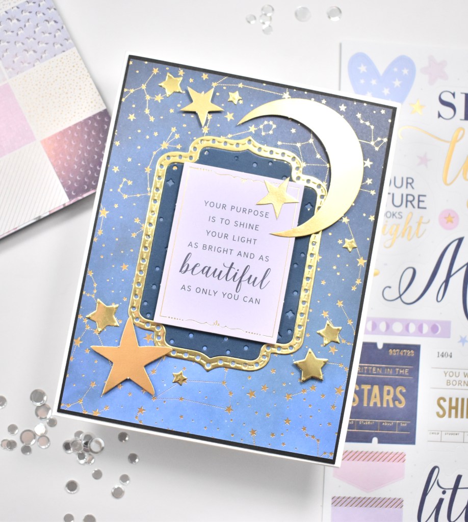 For my second card, I did use the included die cuts to cut this navy and gold frame that surrounds the center sentiment. I glued the frame to the patterned paper and adhered the sentiment using foam tape for dimension. I also adhered the moon and gold stars using a combination of glue and foam tape. I matted it with a panel of black cardstock for contrast.