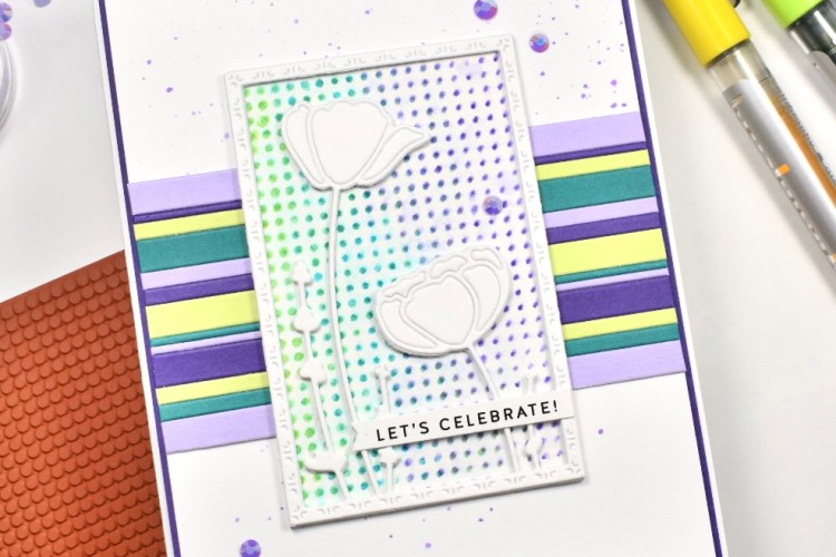Let’s get into today’s fun project where I’m featuring the new Halftone Square Background stamp. To begin, I put a piece of Fluid Hot Press Watercolor paper in my Misti and positioned my stamp. To achieve this look, I basically scribbled Karin Brushmarkers! Super fun, super easy! I chose a few rainbow colors from my set, and I scribbled one color at a time, spritzed it with water, and stamped! What did I say? Super easy, yet I think the results were kind of cool! I repeated that process with the remaining colors.