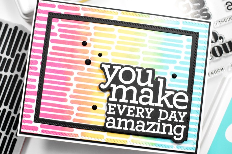 Once the rainbow panel was complete, I trimmed it out using the PinkFresh Studio Diagonal Stitched Rectangle. I also used the smaller set of the rectangles to create this black frame. I stamped the sentiment, which is from the SSS Spring In My Step set, onto black cardstock using VersaMark Ink and heat set that using SSS Detail White Embossing Powder. I then used the coordinating die to cut it out. I used the die to cut two more blank sentiments and adhered all of those together using liquid glue.