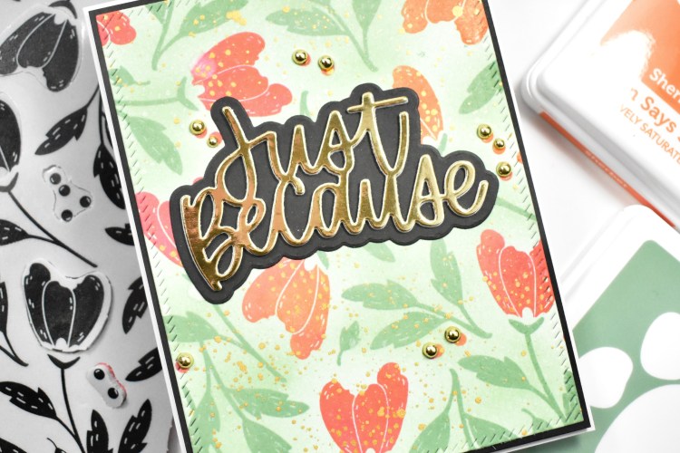 While that dried, I die cut the SSS Just Because sentiment once from polished gold cardstock, and twice from Neenah 110lb, adhering all of those together using liquid glue. I also die cut the shadow once from black cardstock as well. I glued the sentiment to the panel and added some PinkFresh Gold Metallic Pearls, because we all need bling!