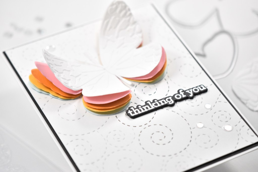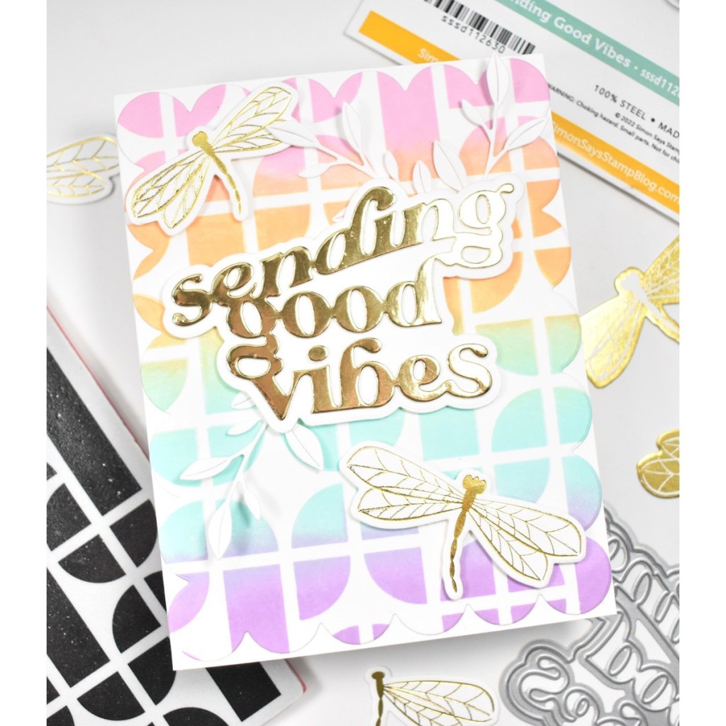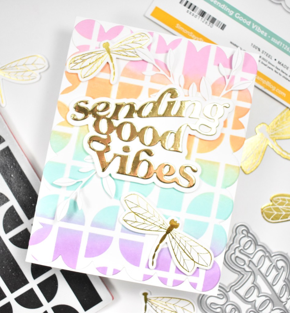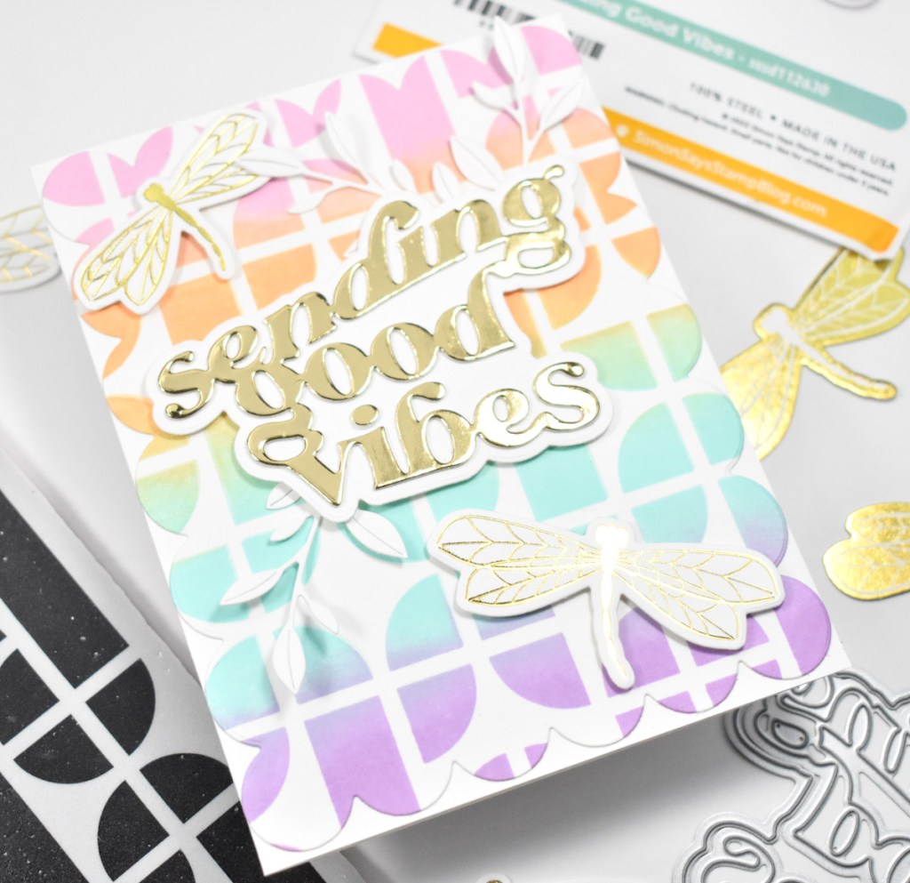 For the sentiment, I opted to use the SSS Sending Good Vibes die and cut that once from Polished Gold cardstock and once from Neenah 110lb, while cutting the shadow once from the same white cardstock. I adhered all of those together using liquid glue and placed foam tape on the back. I also placed foam tape on the back of the dragonflies as well.