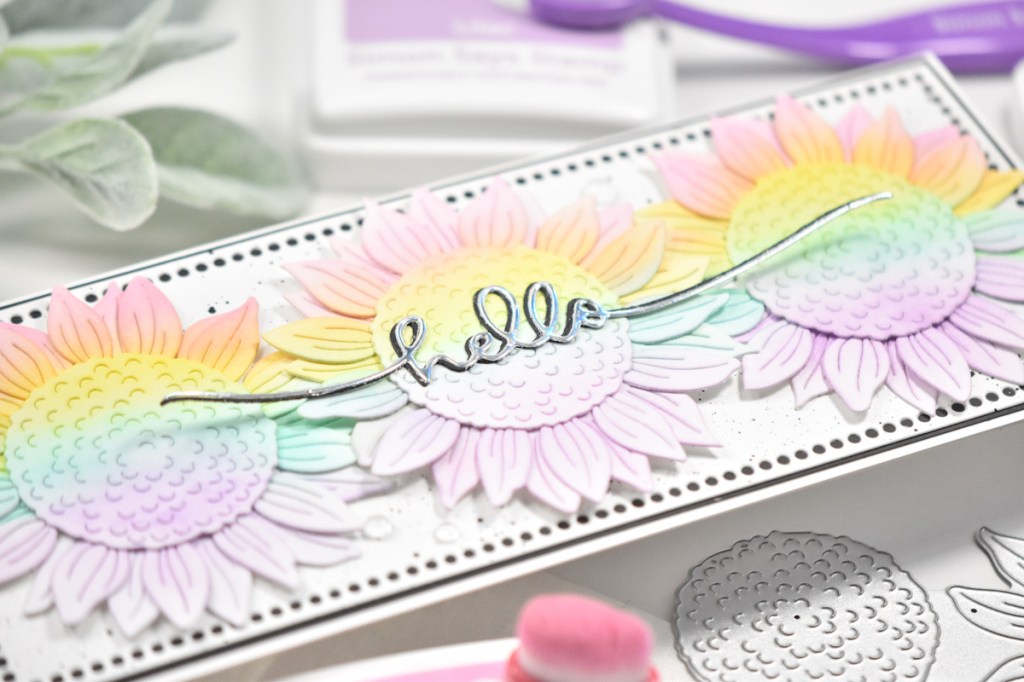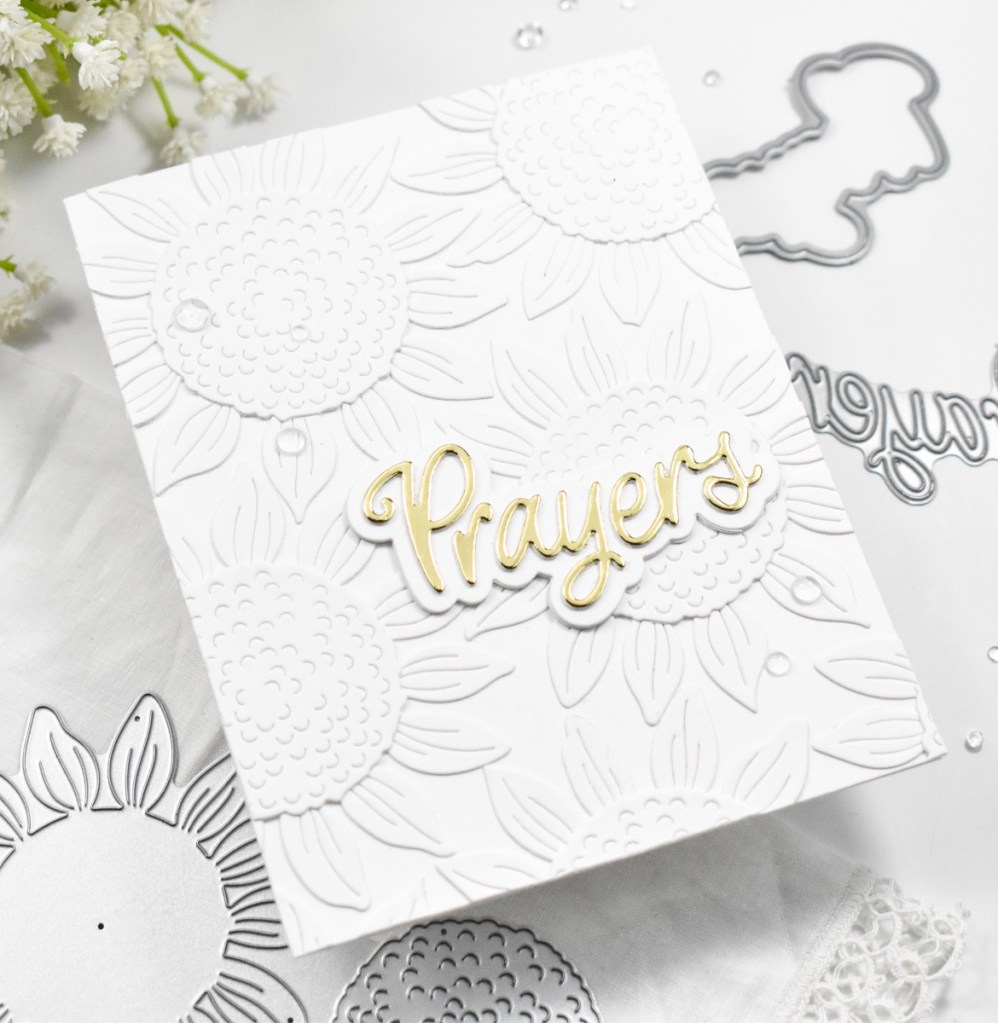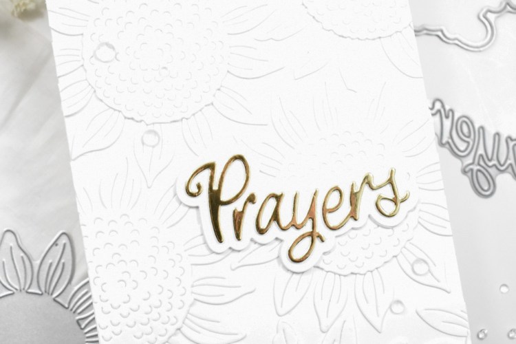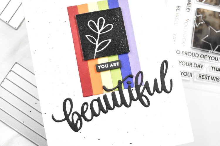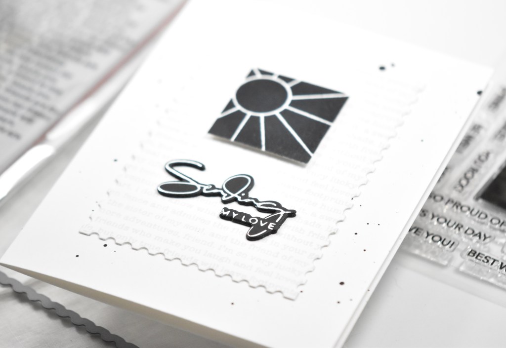 I pulled out the SSS Friendship Text Background stamp and stamped that onto a panel using PFS Misty Coast ink and trimmed it down using the SSS Postage Stamp Edge Frames. I foiled this sentiment from Spellbinders Yana’s Sentiments using silver foil onto black cardstock and trimmed it out using the included coordinating die. I cut it an additional two times and glued all of those together for added dimension.