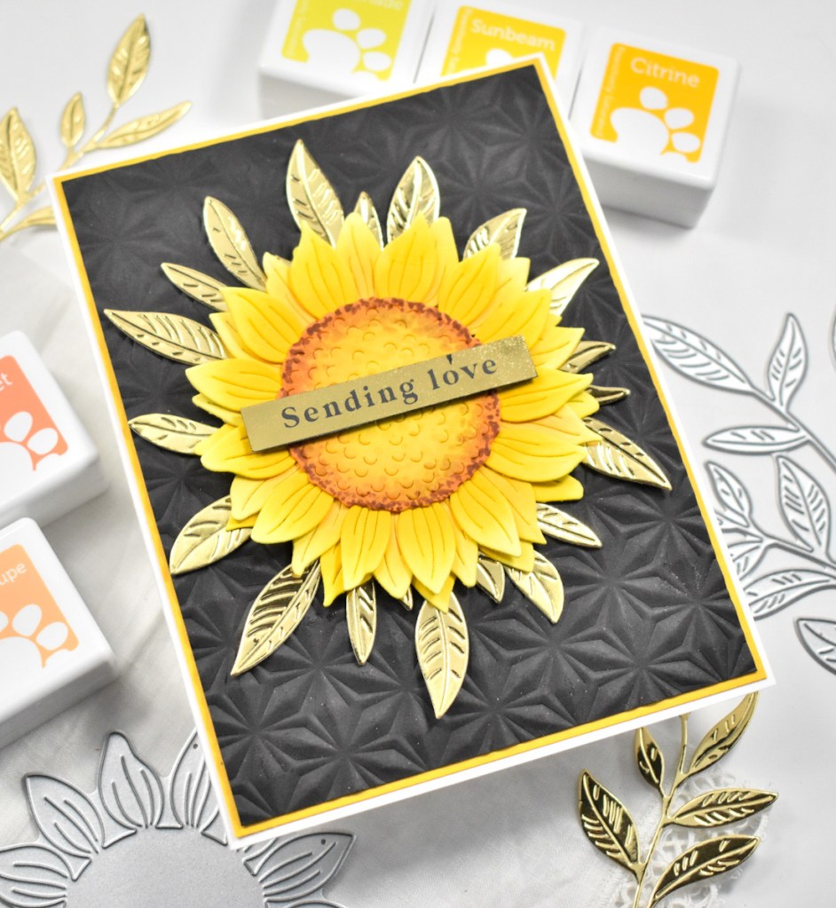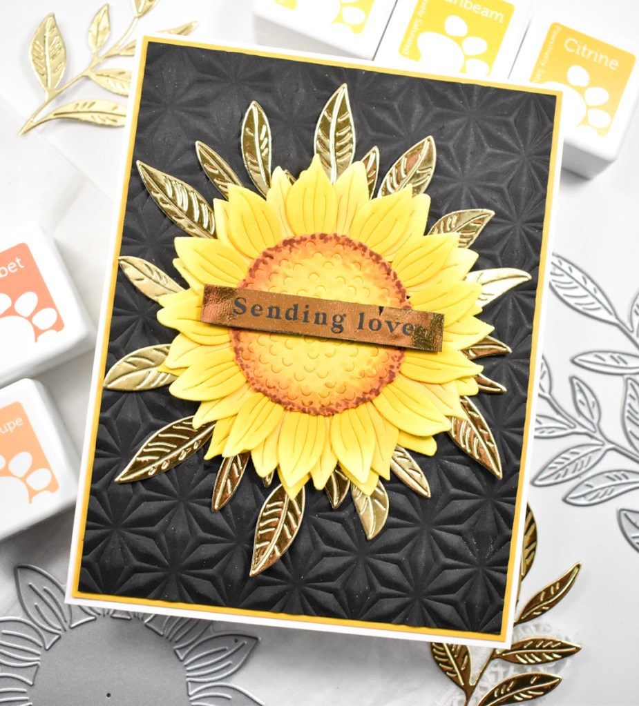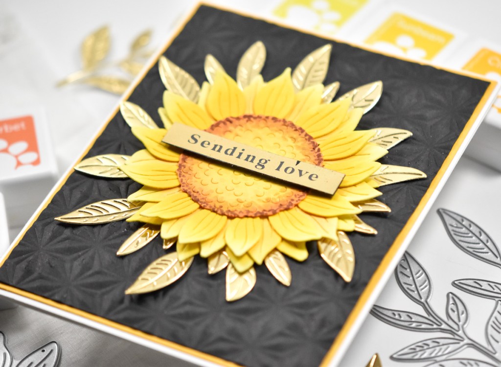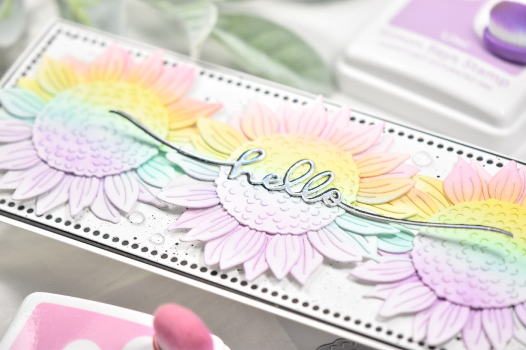 I pulled out the SSS Friendship Text Background stamp and stamped that onto a panel using PFS Misty Coast ink and trimmed it down using the SSS Postage Stamp Edge Frames. I foiled this sentiment from Spellbinders Yana’s Sentiments using silver foil onto black cardstock and trimmed it out using the included coordinating die. I cut it an additional two times and glued all of those together for added dimension.