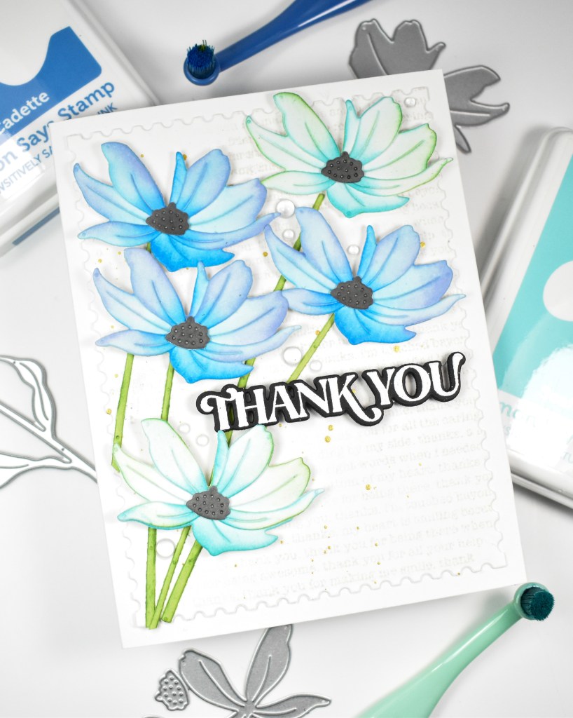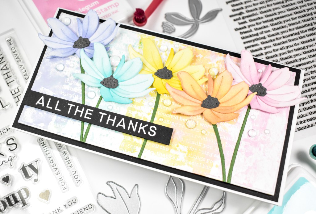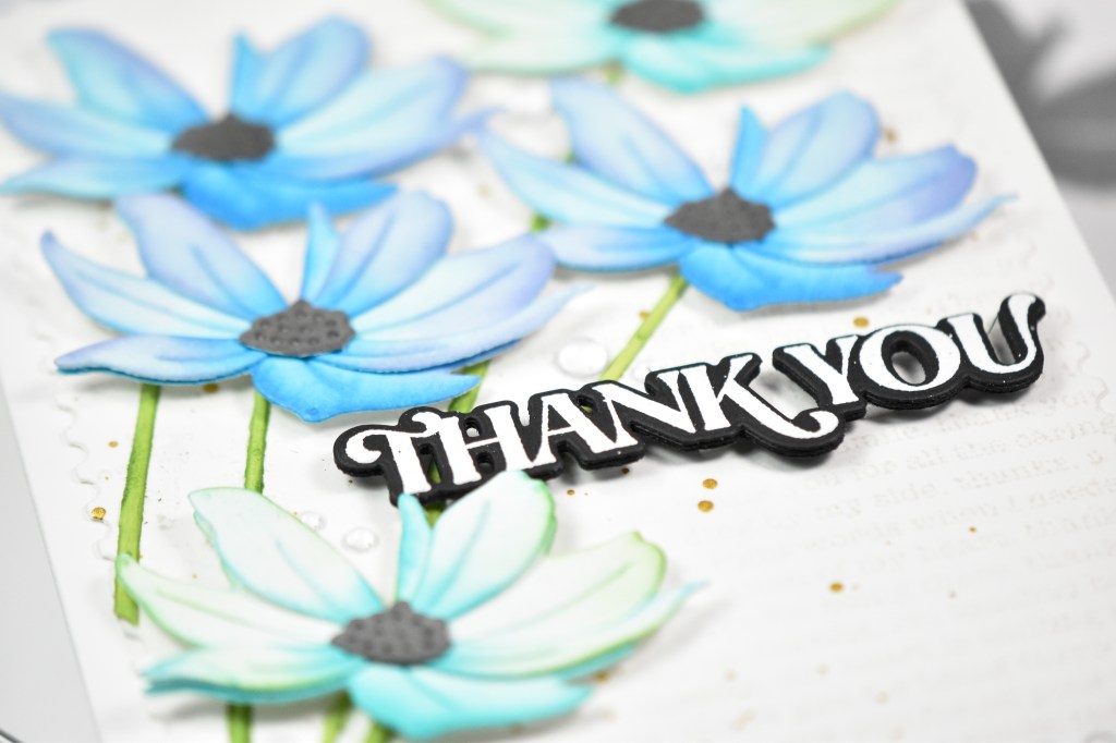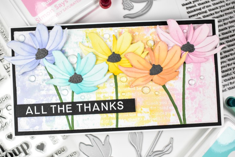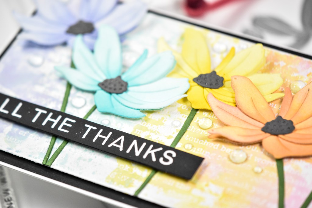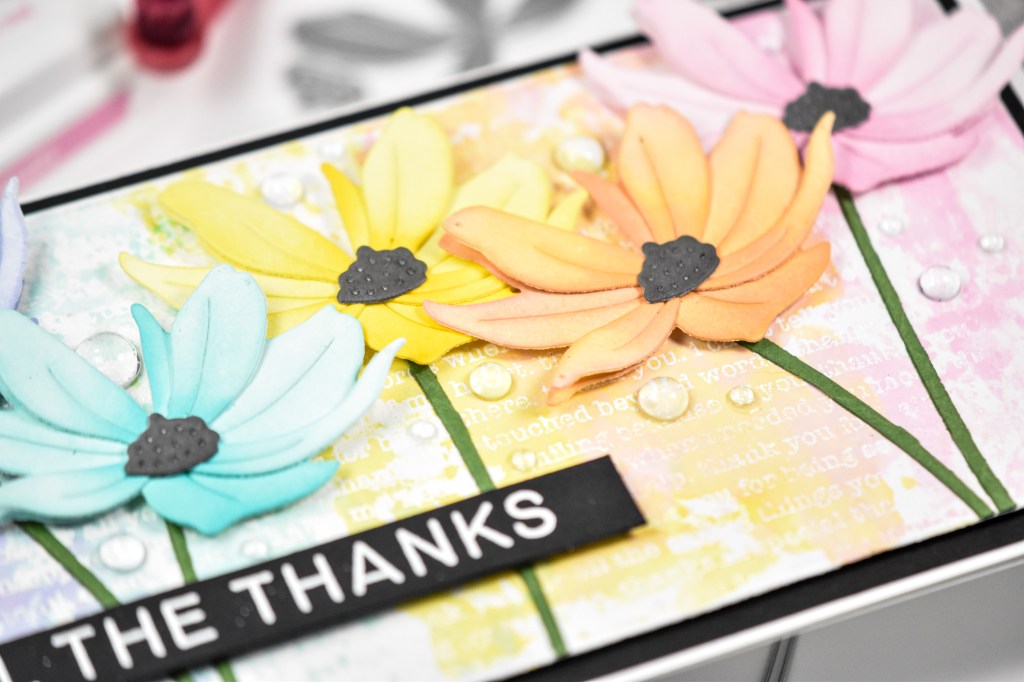 The flowers and stems were die cut from Cotton Candy, Green Apple and black cardstock. I used the same inks for the ink blending on these pieces as well. I assembled the flowers and placed foam strips on those before stamping the sentiment onto black cardstock and heat setting that using Detail White Embossing Powder.