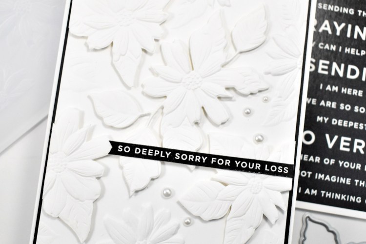 Next, I played around with the placement of the flowers and leaves and began gluing the leaves in place first, then the grey flowers were next, and the magnolia was adhered atop all of that using SSS 3D Foam Strips. Some of the leaves were cut and tucked in where needed, and I glued white pearls to all of the areas with a little stem. The panel was then adhered to a black panel before being adhered to the card base.