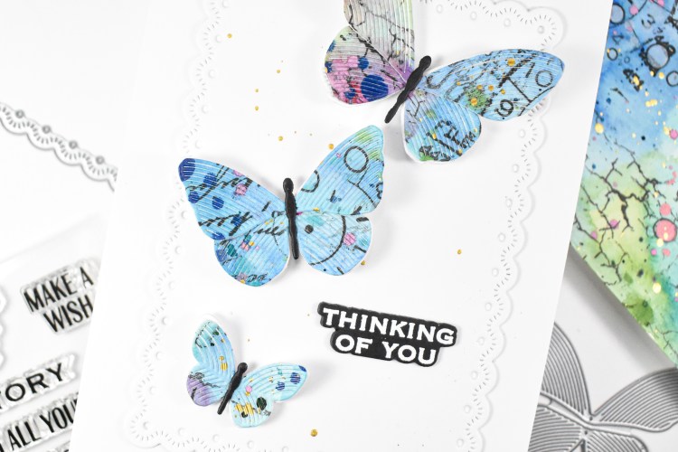 The butterflies were cut from the watercolor panel, as well as from white cardstock, while the bodies were cut from black cardstock. Those were adhered together and foam tape was placed on the back. The panel was created using the Eyelet Layer Frames with more gold splatter to bring everything together. The sentiment was stamped, stacked and adhered to the panel using liquid glue, and the butterflies were added to finish up.